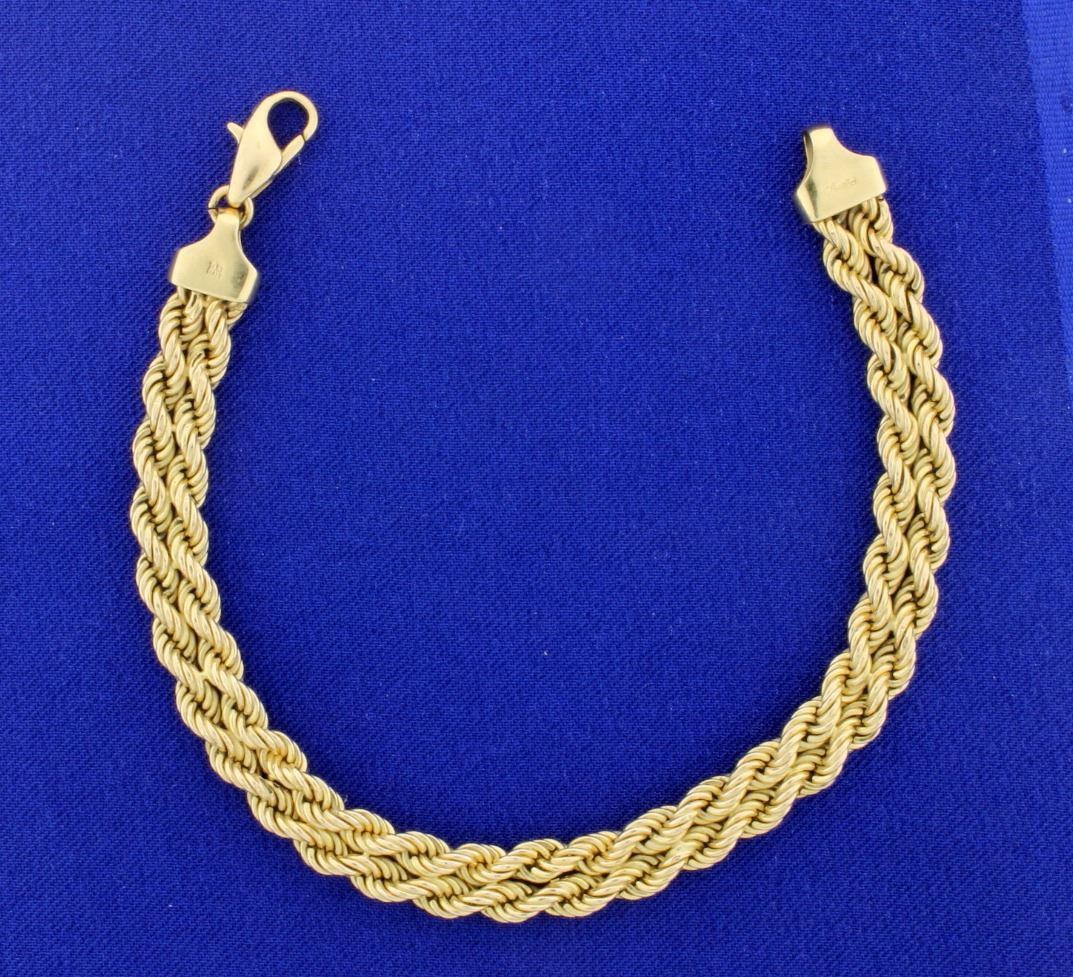 In 14K yellow gold it is 8 inches long and 7.6mm thick and has a lobster clasp. 10.2g