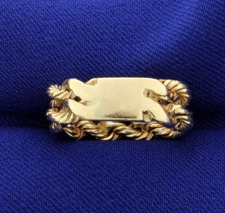 In 14K yellow gold, the ring is 7mm wide. Size 4 1/2 6.6g