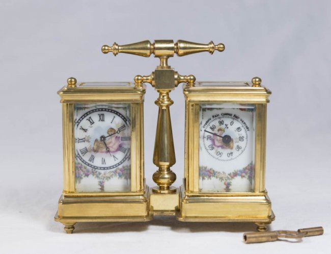 Reproduction clock and barometer. With cherubs and floral motif. With key. Approx. 4 1/2" H x 4 1/2" W x 2" D.