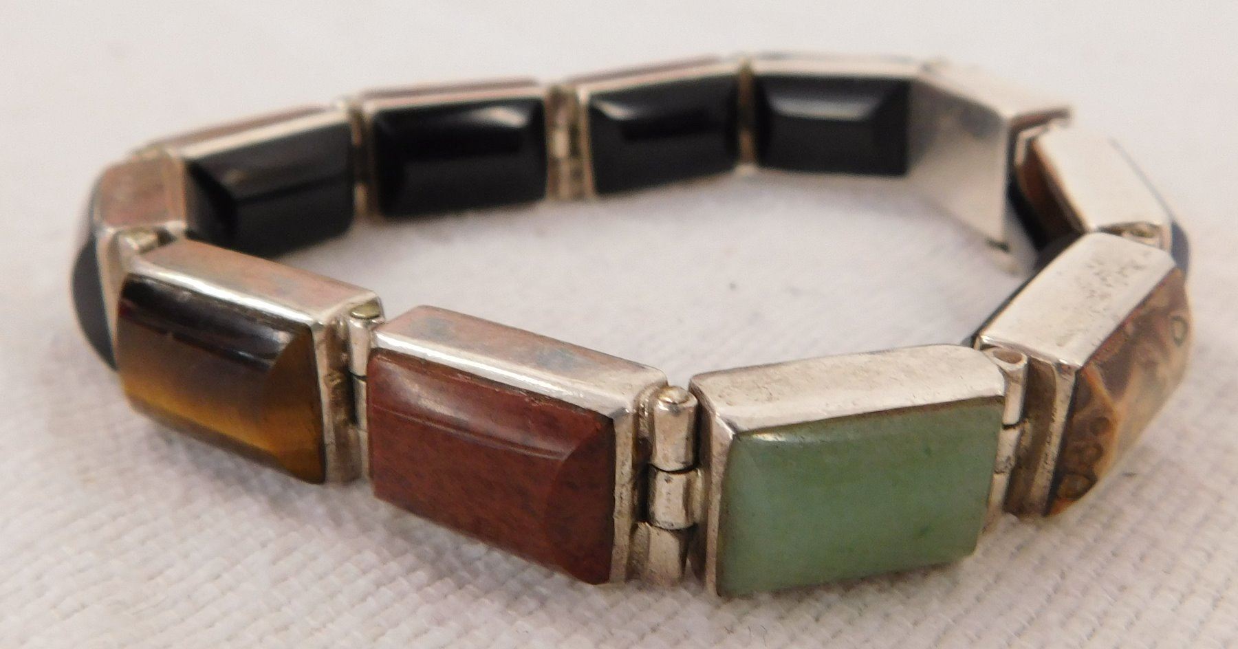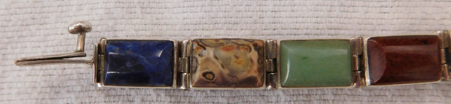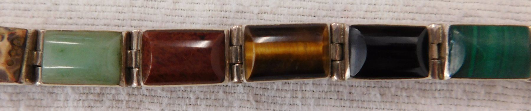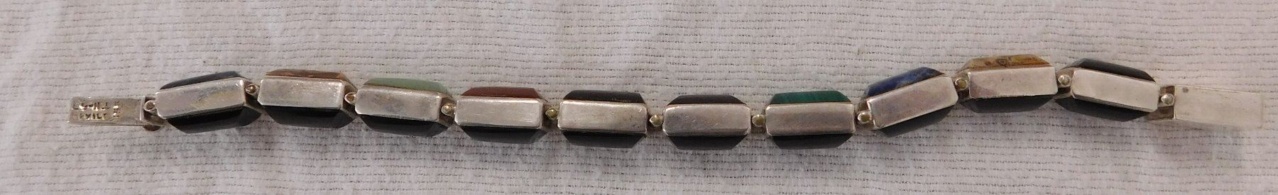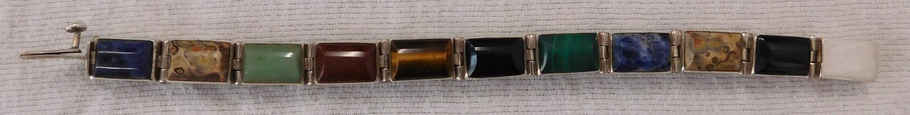 Double-Sided Bracelet w/Stonework, circa 1960s. Made of sterling silver and gemstones, the item measures 8" x 1/2". Signed Mexico. This bracelet weighs approx. 49.2 grams and has a beautiful, variety of gemstones. Condition: Good, see images. Shipping: $14.50 w/insurance and signature.