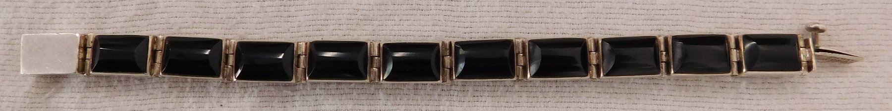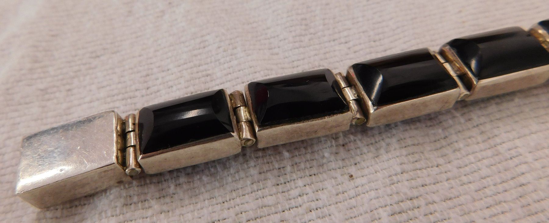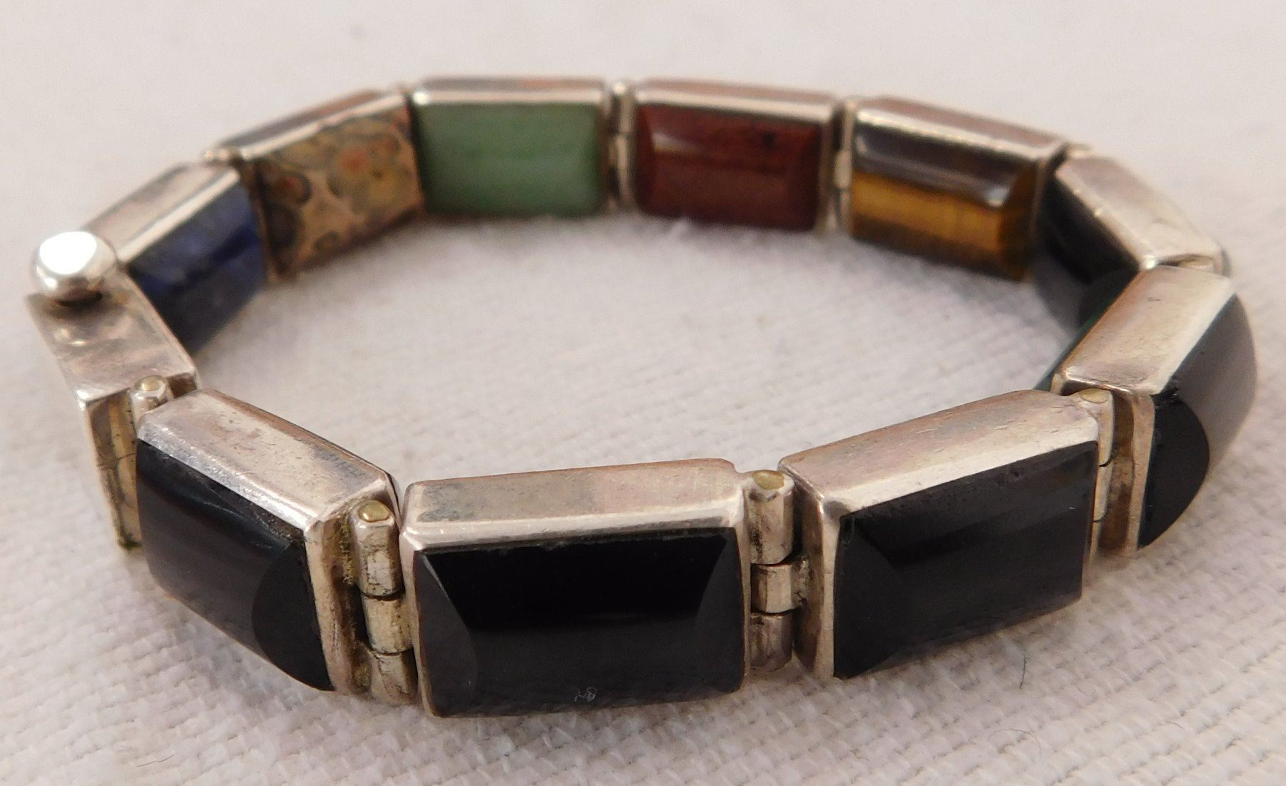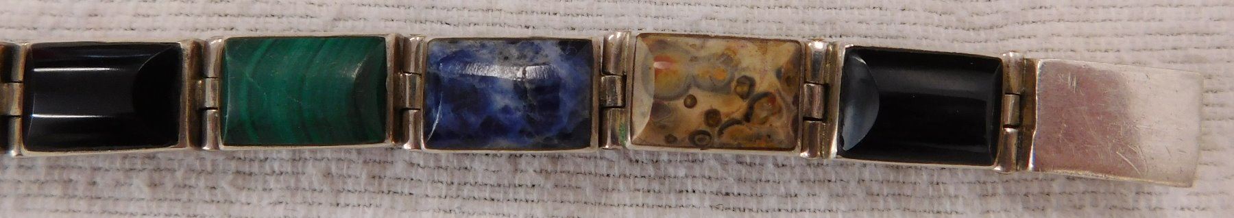 Double-Sided Bracelet w/Stonework, circa 1960s. Made of sterling silver and gemstones, the item measures 8" x 1/2". Signed Mexico. This bracelet weighs approx. 49.2 grams and has a beautiful, variety of gemstones. Condition: Good, see images. Shipping: $14.50 w/insurance and signature.