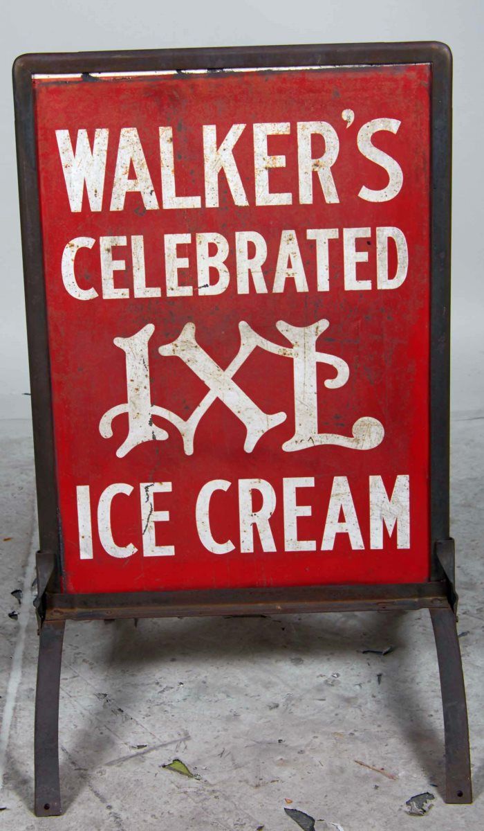 In a metal frame with stand. "Walker's Celebrated IXL Ice Cream." Ca. 1940s Condition Good Size 20" x 23" x 24"
