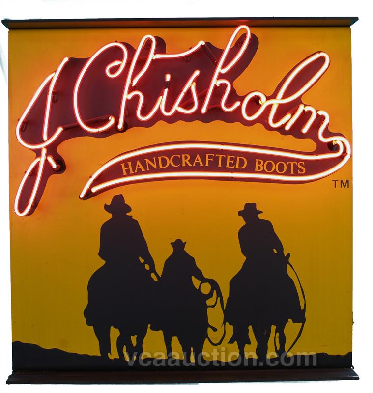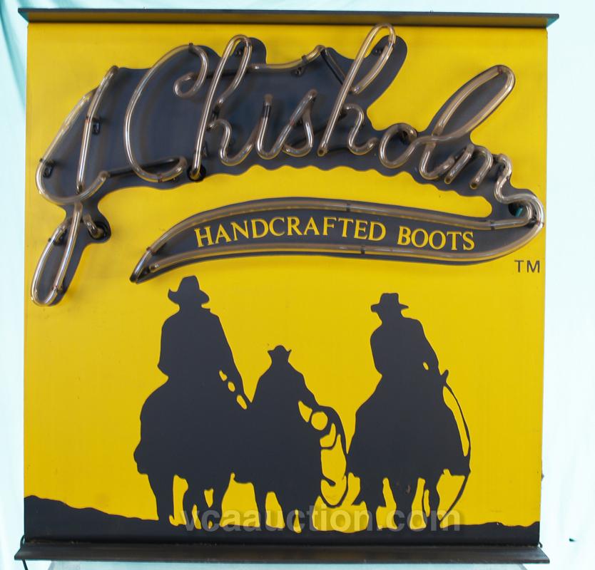 Double Sided Window Hanging Sign "J. Chisholm Handcrafted Boots" (Cowboy) Yellow & Black w/ Red Neon (One Side) - 27" x 7" x 28"