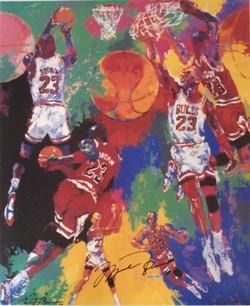LeRoy Neiman portrays several differen facets of Michael Jordan's style of play. Jordan is showing you why he's one of the, if not the greatest basketball player to ever play the game. * Artist: LeRoy NeimanAutograph: Michael JordanMedium: LithographEdition Size: N/AYear: 1991COA: AllstarsArt & UDA (Upper Deck Authenticated)Dimensions: 24" x 20"Other: UDA #'d hologram affixed to the artRetail Price: $2,500.00LeRoy Neiman is certainly one of our most popular and prolific contemporary artists. His work consistently garners popular praise and critical acclaim. This is an exciting work by the man who has transformed "sports art" into "fine art." *