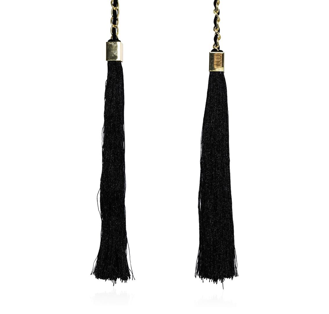 High end designer jewelry. Double Silk Tassel Braided Necklace - Gold Plated. Gold Plated Metal/ Suede. Black/ Gold. 46/7.5inches. Total Weight: 96.7 grams.