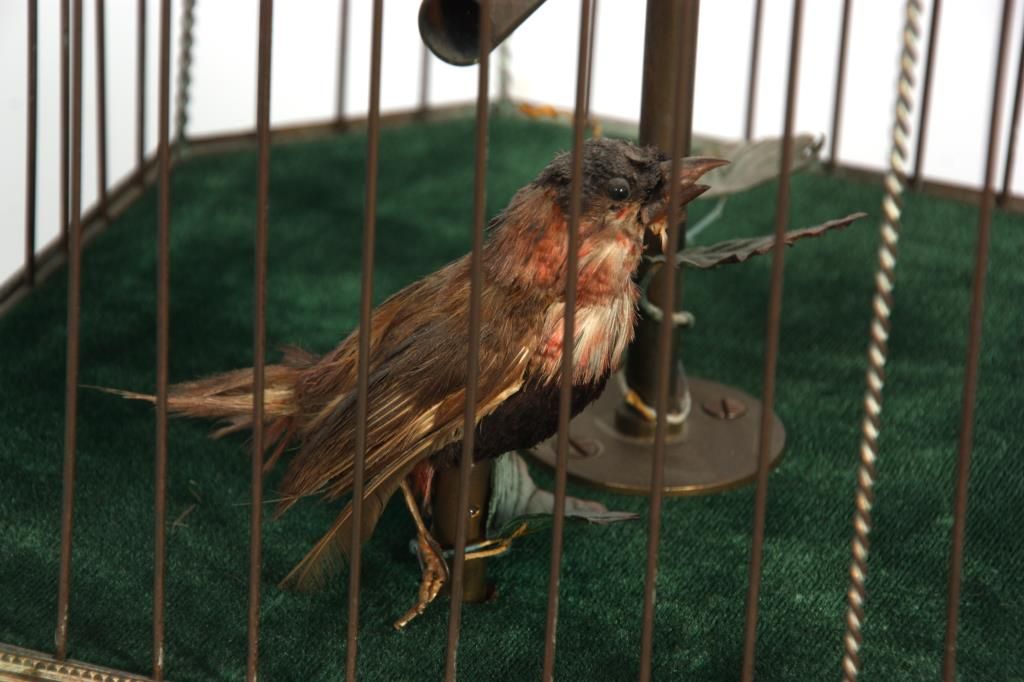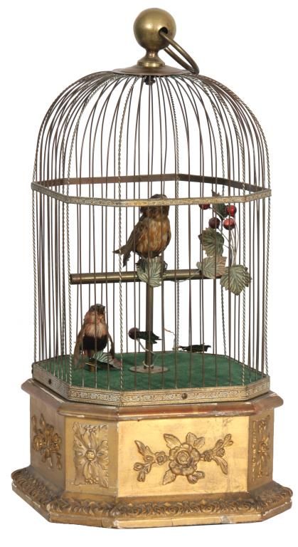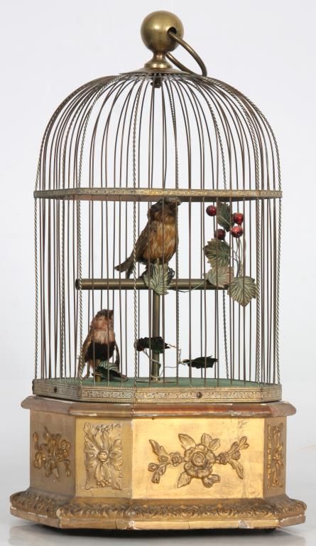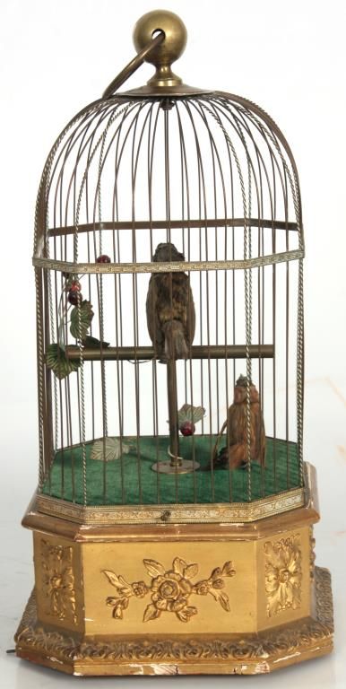 Double Singing Bird Cage Automaton. Brass wire domed bird cage with brass finial and ring handle on a wood, gilt and carved gesso carved square base with chamfered corners and wind on the right side; 2 birds inside, one on a brass perch with colorful feathers, beaded eyes and surrounding filigree. The mechanical birds flick their tails, rotate their heads and move their beaks while whistling a tune. Birds move with nice brisk motion, spring winds and holds power, birds whistle with a muffled tone. 21 in. high x 10 in. wide x 10 in. deep.