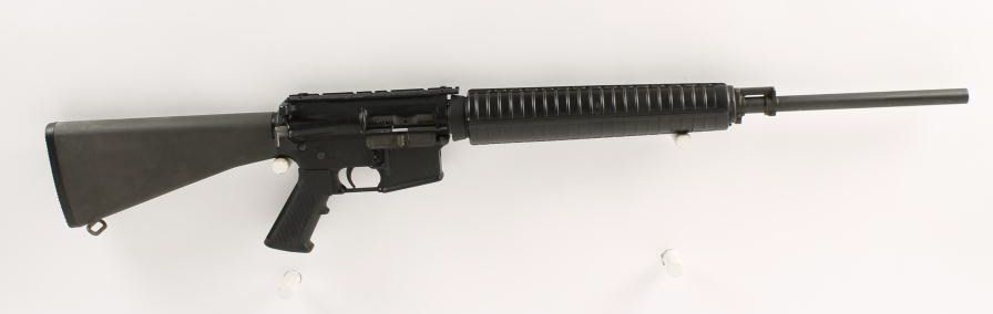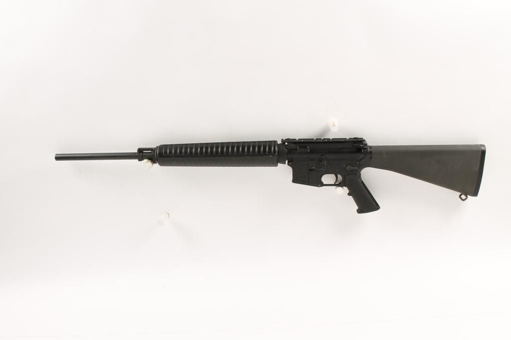 Double Star Mdl Star 15 Cal 5.56mm SN:DSCG6574AR style semi auto rifle with 24" barrel, black finish, black plastic stock, grip and hand guard, No sights, with Picatinny rail, good bore and action. NO magazine. Condition: Good showing use, light scratching in finish.