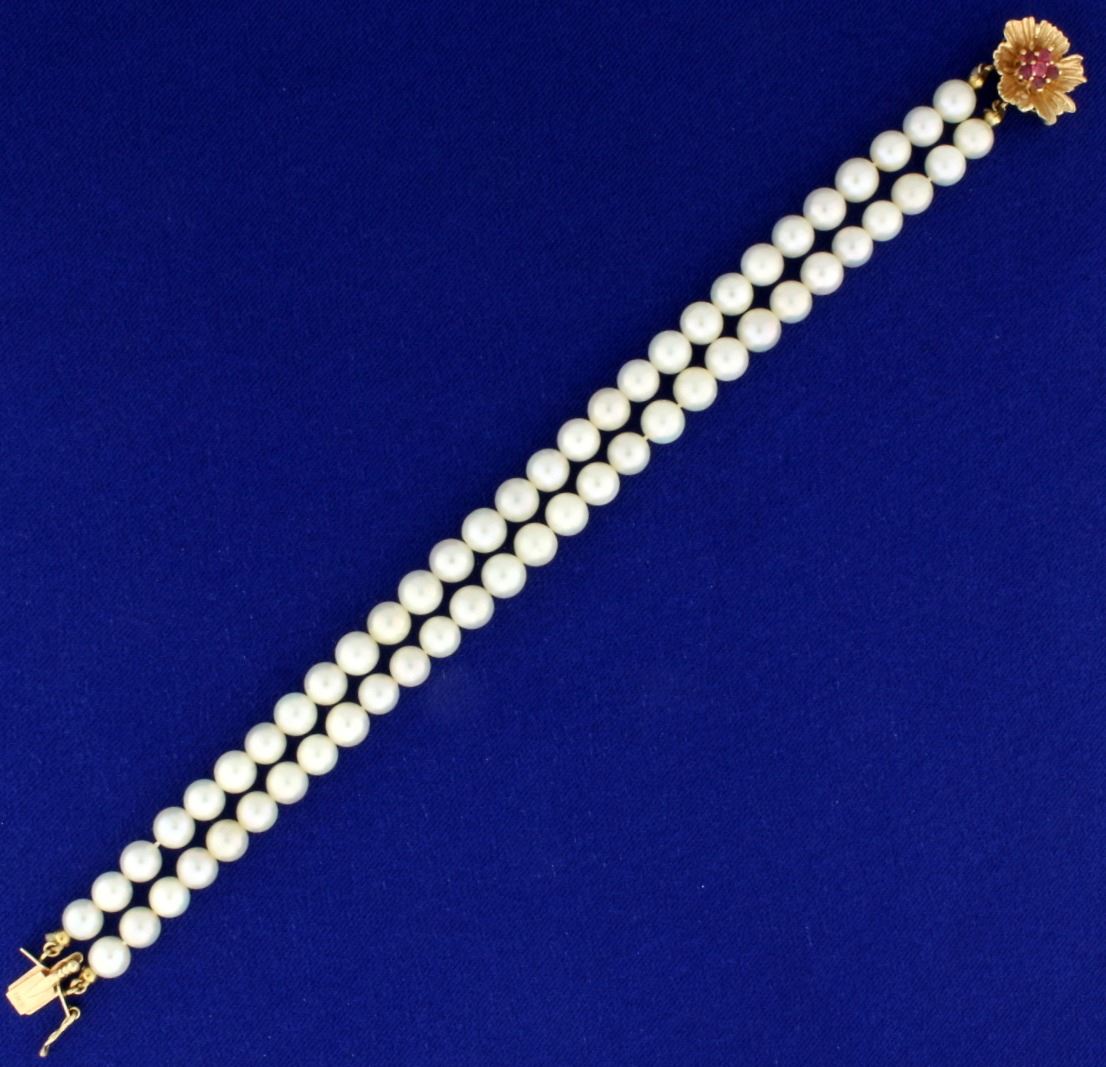 In 14k yellow gold. Containing fifty eight high quality 6mm Akoya Natural Pearls with excellent color and luster. Clasp contains five 2mm natural rubies with vibrant red color. 7 1/4" long with safety clasp. 18.1g.