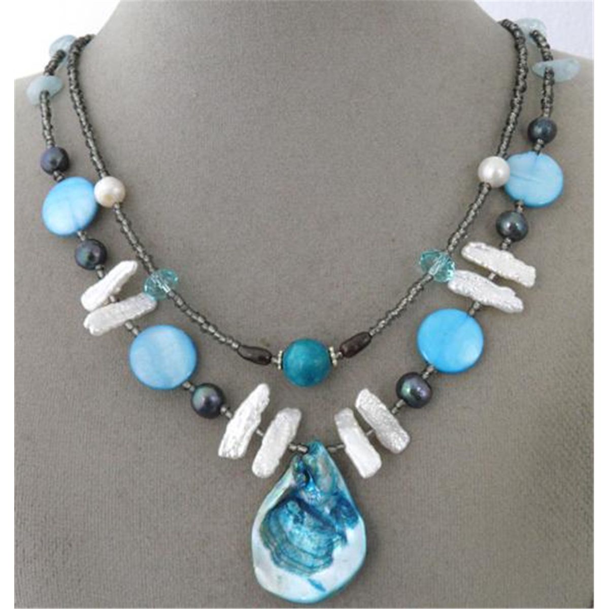 Double Strand Handcrafted Mother-of-Pearl shell pendant and bead necklace, neckalce length 17.5in, pendant dimensions 1.25inX0.75in, silver toggle closure.