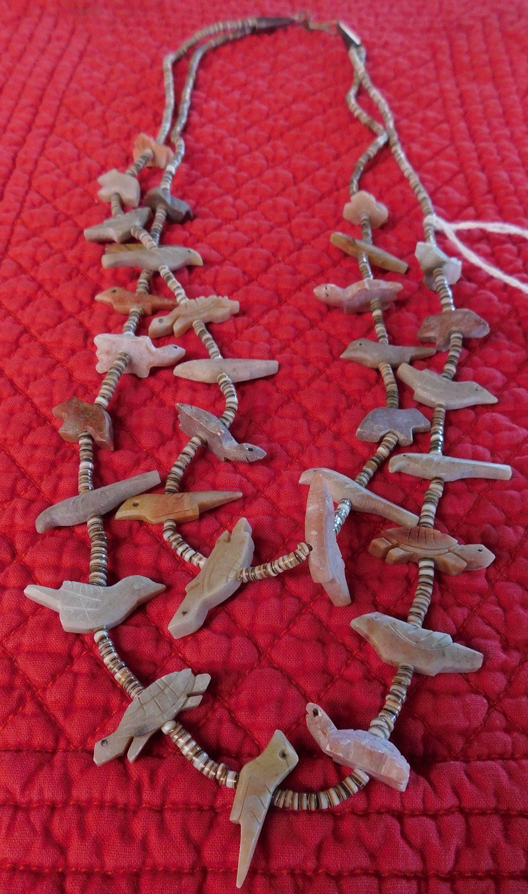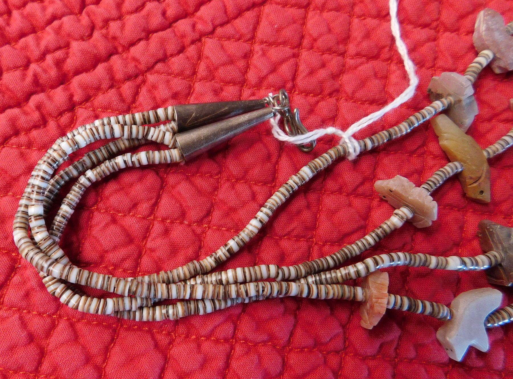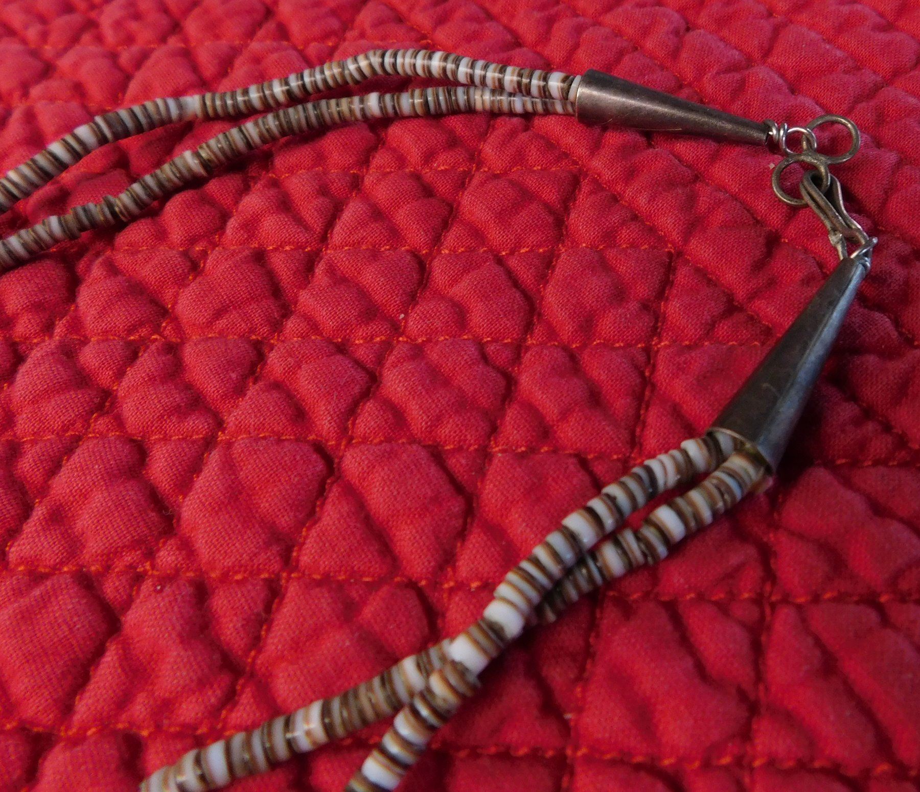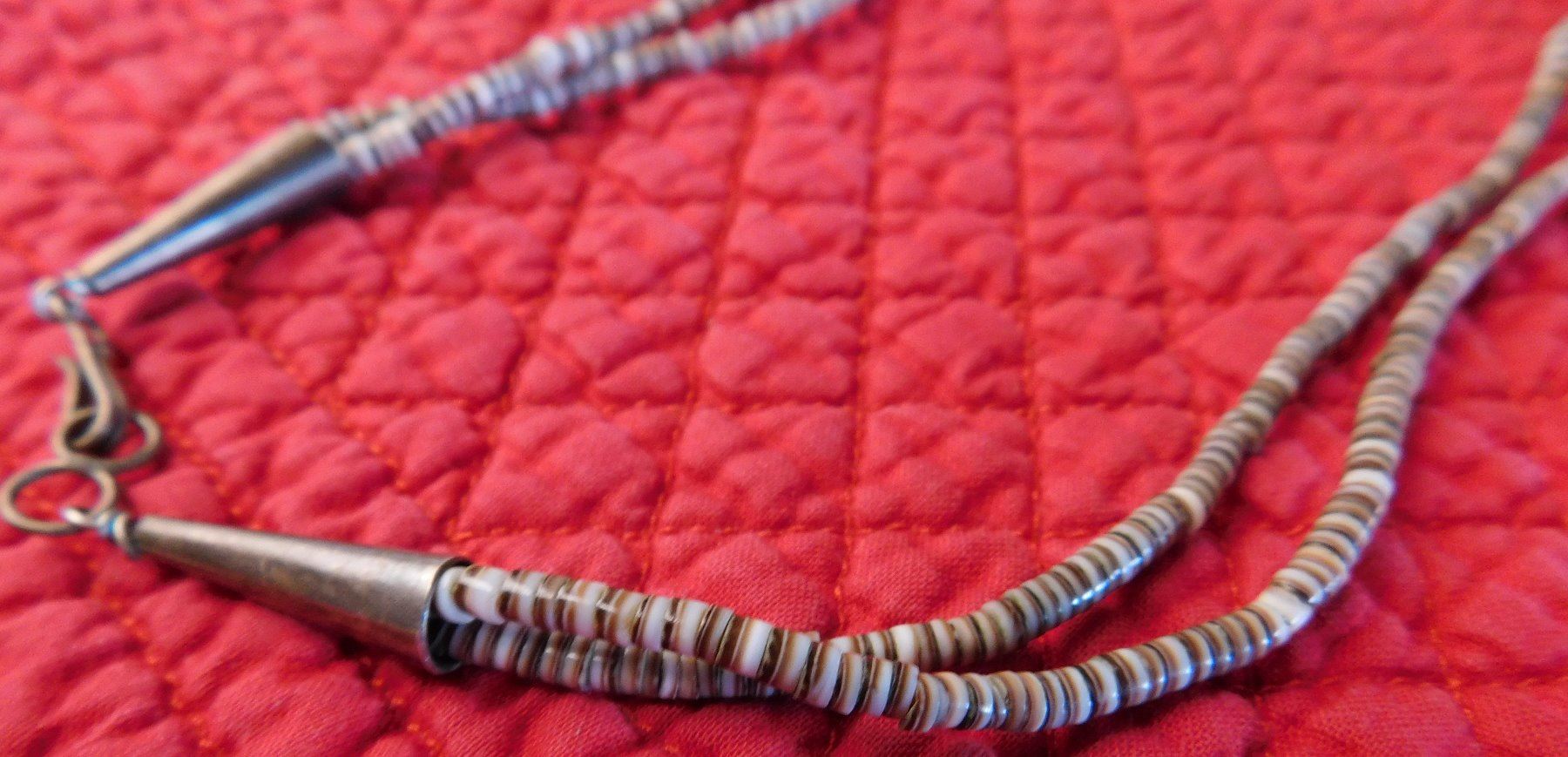 Double Strand Heishi Necklace, c. 1970s. Made of heishi shell and stone, the item hangs about 13" as worn. Santo Domingo-Kewa, New Mexico. Condition: Good, see images. Shipping: $12.50 w/insurance and signature.