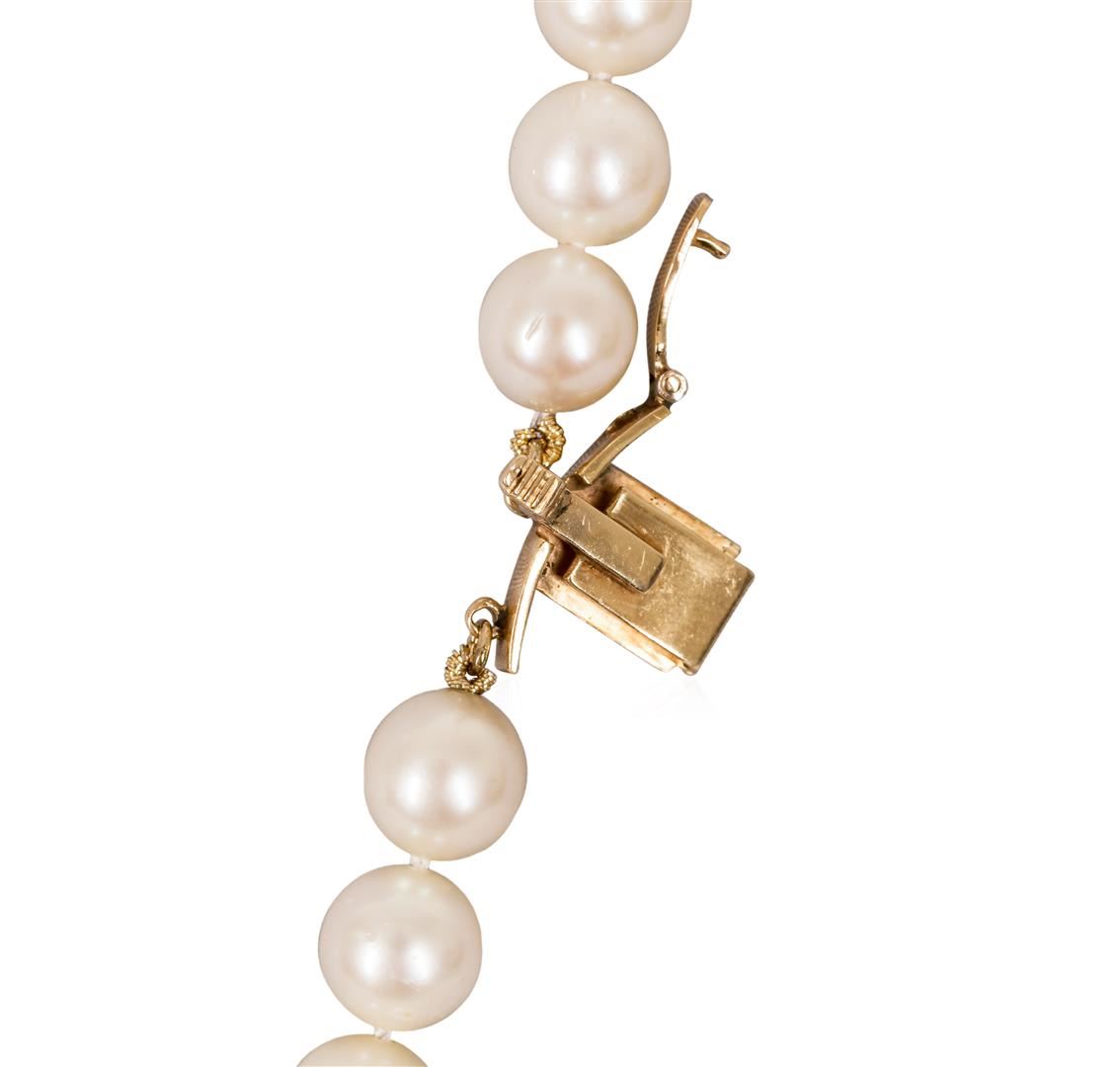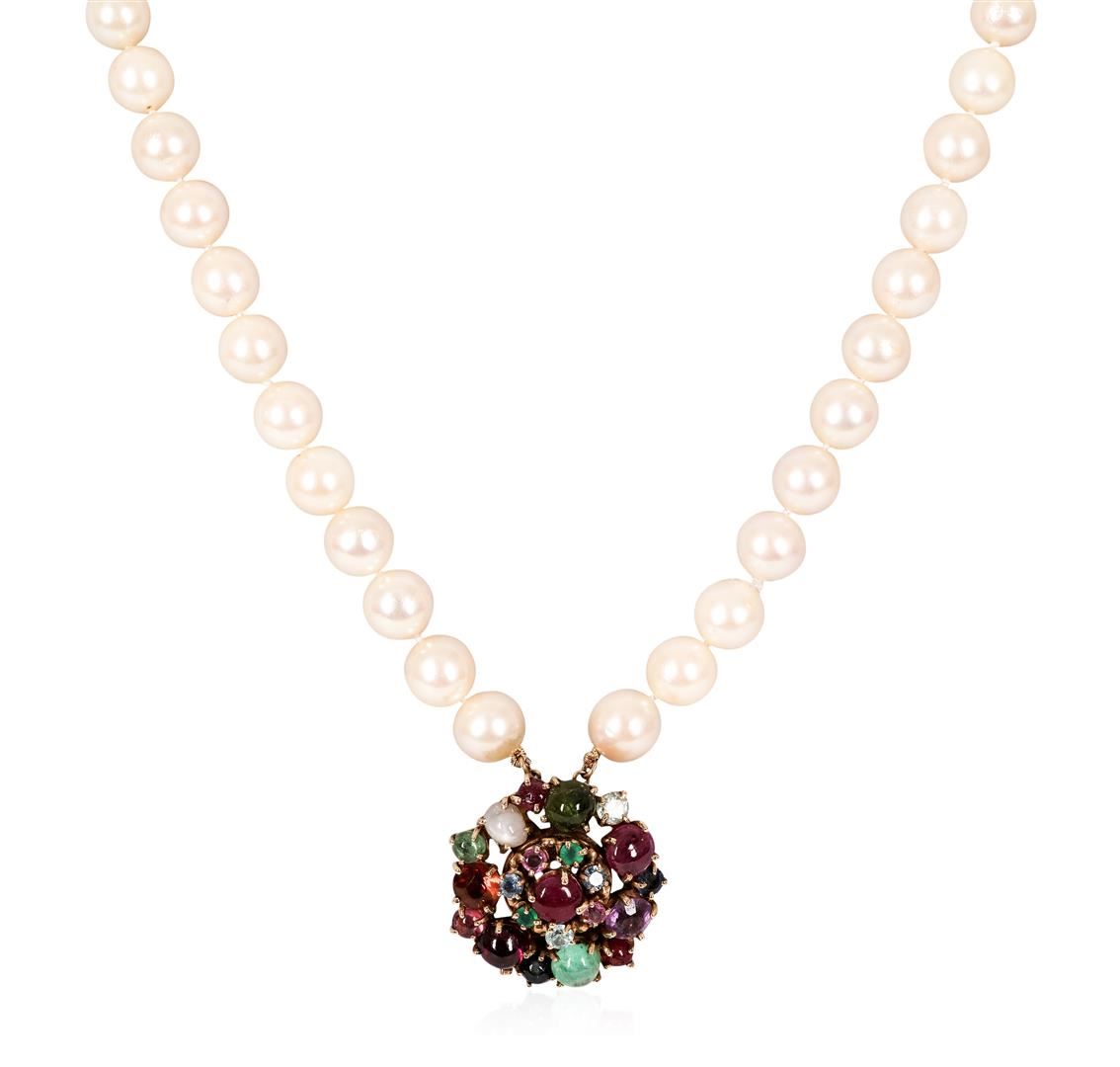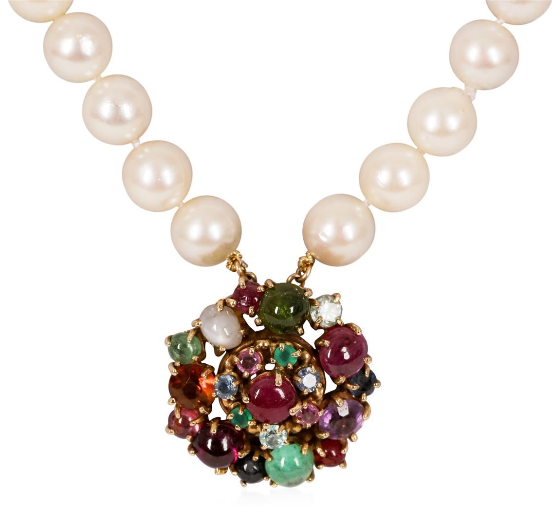 One lady's double strand pearl choker necklace measuring approximately 15.5 inches in length. The pearl range in size from 7.6 to 8.3mm. The necklace has an attached 14KT yellow gold clasp weighing 16.0 grams containing multi-colored natural gemstones.