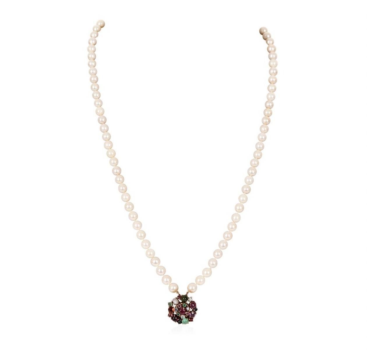 One lady's double strand pearl choker necklace measuring approximately 15.5 inches in length. The pearl range in size from 7.6 to 8.3mm. The necklace has an attached 14KT yellow gold clasp weighing 16.0 grams containing multi-colored natural gemstones.