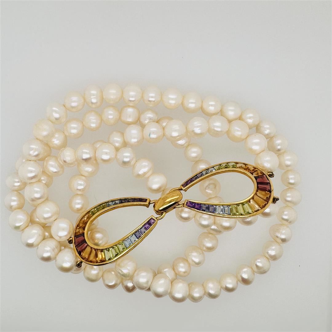 Double strand white pearl necklace with large 14k yellow gold double horseshoe clasp set with invisible set graduated tourmalines; gross weight 85.1g, L 18" (approx.)