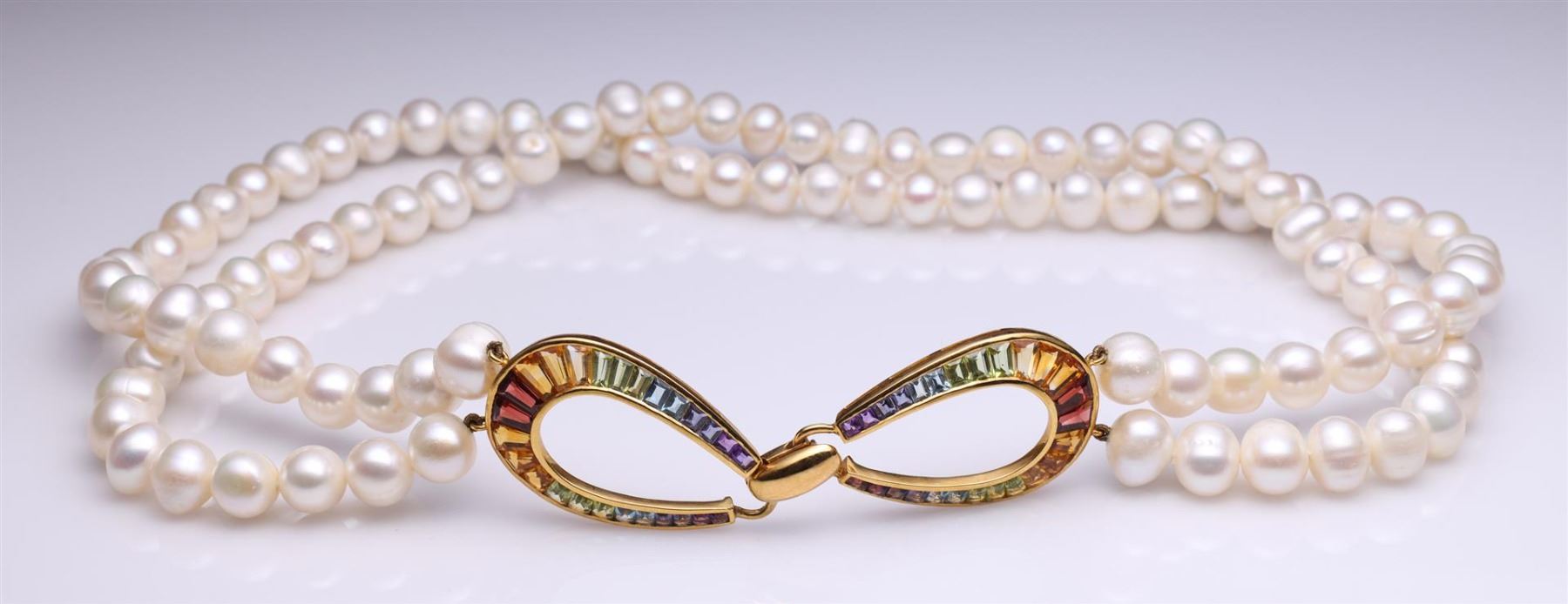Double strand white pearl necklace with large 14k yellow gold double horseshoe clasp set with invisible set graduated tourmalines; gross weight 85.1g, L 18" (approx.)