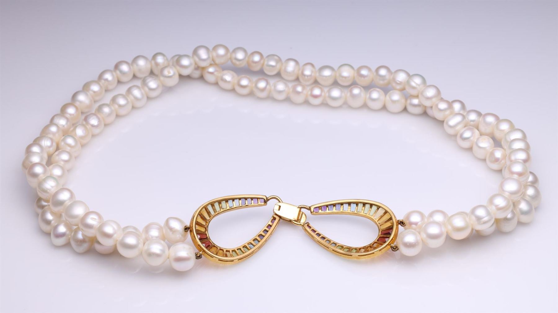 Double strand white pearl necklace with large 14k yellow gold double horseshoe clasp set with invisible set graduated tourmalines; gross weight 85.1g, L 18" (approx.)