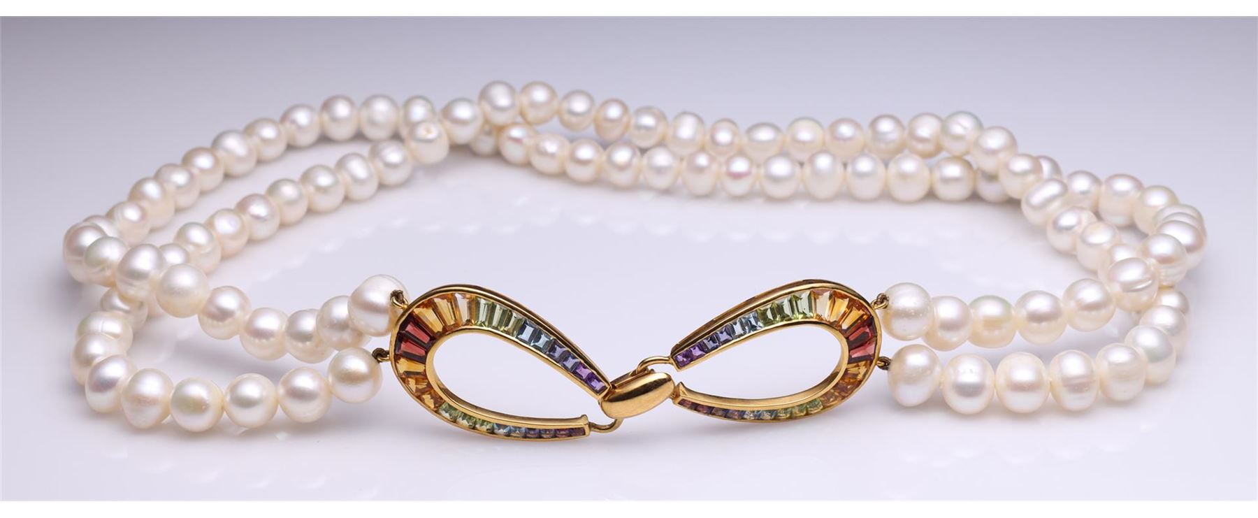Double Strand Pearl Necklace With 14K Yellow Gold & Graduated Multi Color Gemstone Clasp. Total weight of 85.2 gm. Estimated retail value $4,500.