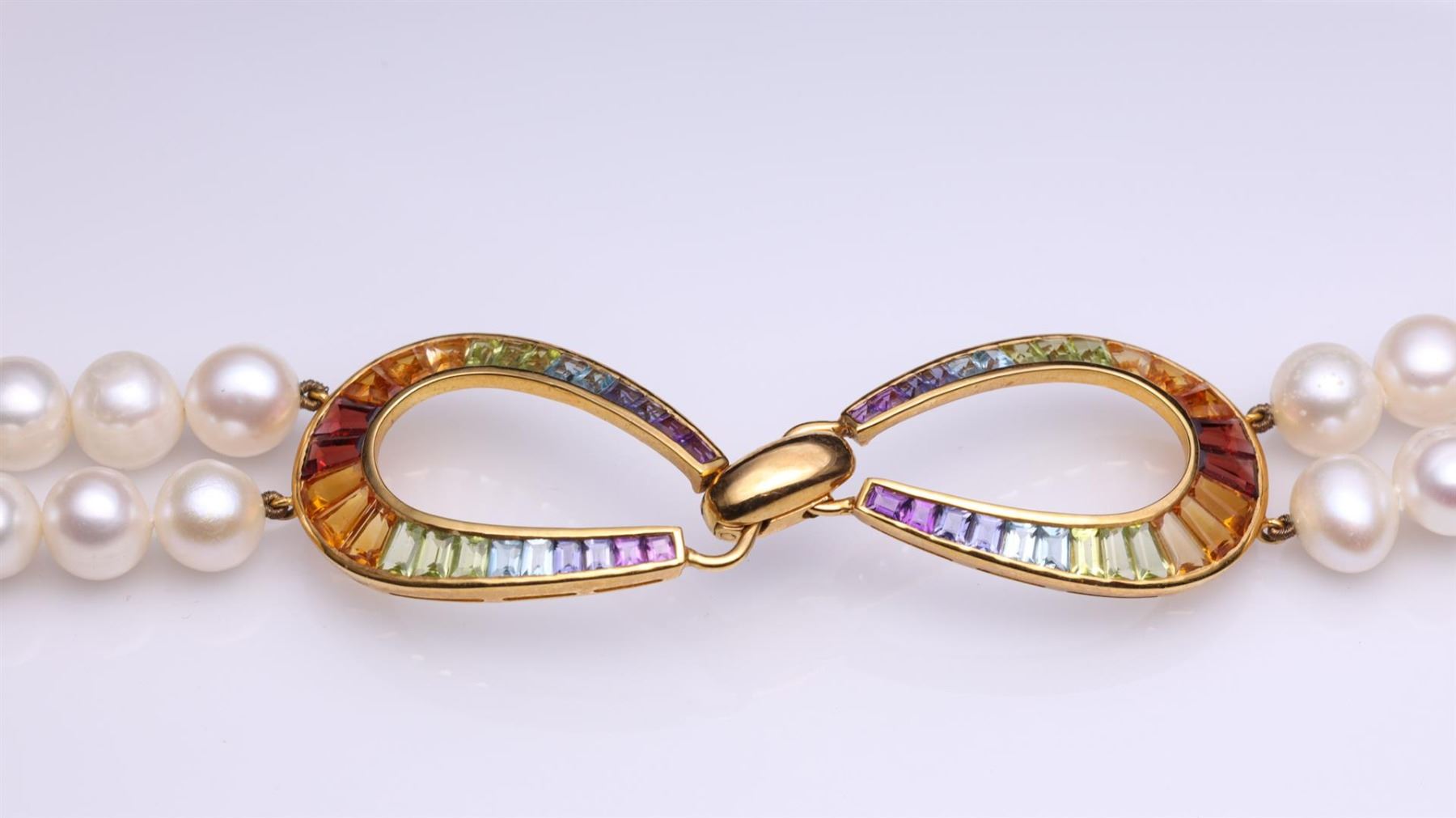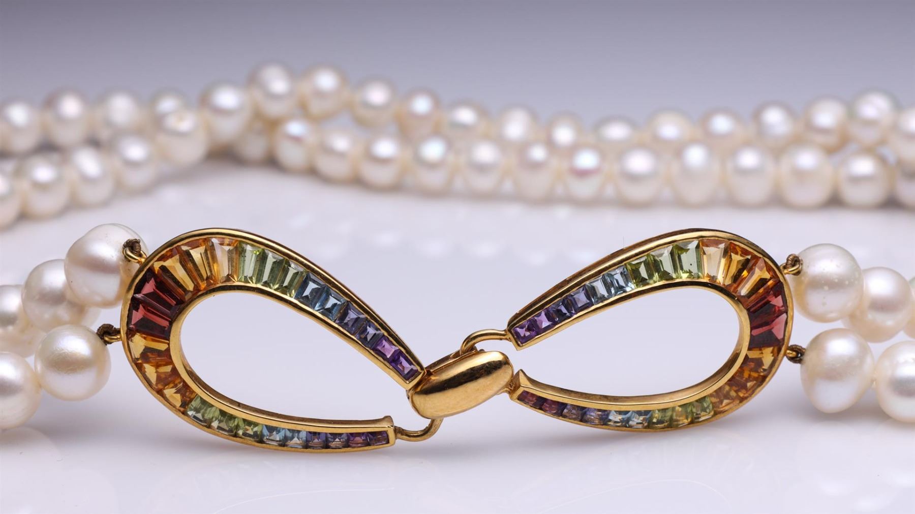 Double Strand Pearl Necklace With 14K Yellow Gold & Graduated Multi Color Gemstone Clasp. Total weight of 85.2 gm. Estimated retail value $4,500.
