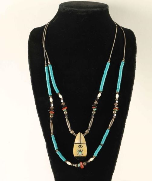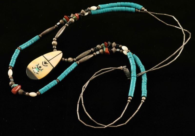 Silver beads with turquoise, mother of pearl, coral and jet. Inlaid 1 7/8" teardop pendant with mother of pearl, turquoise and jet with figure and symbols.