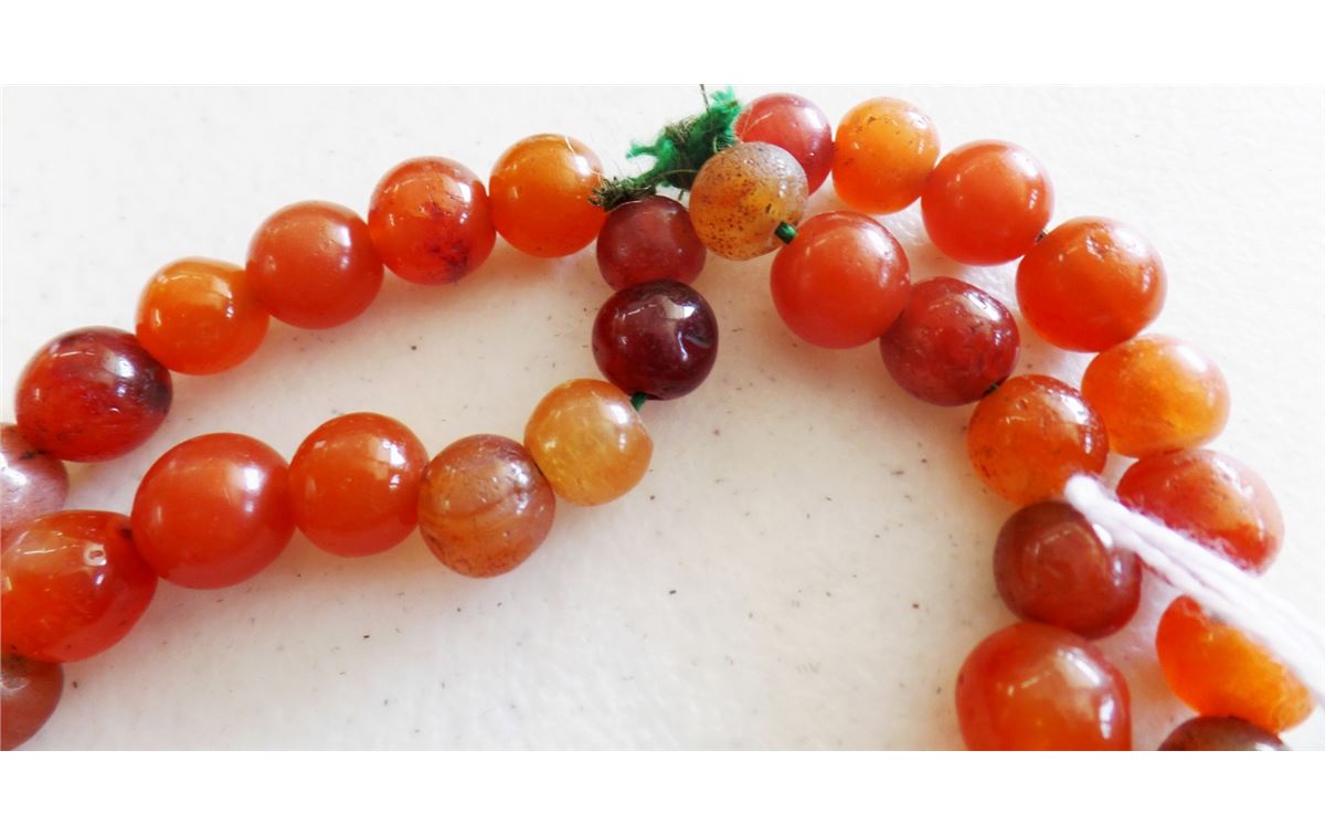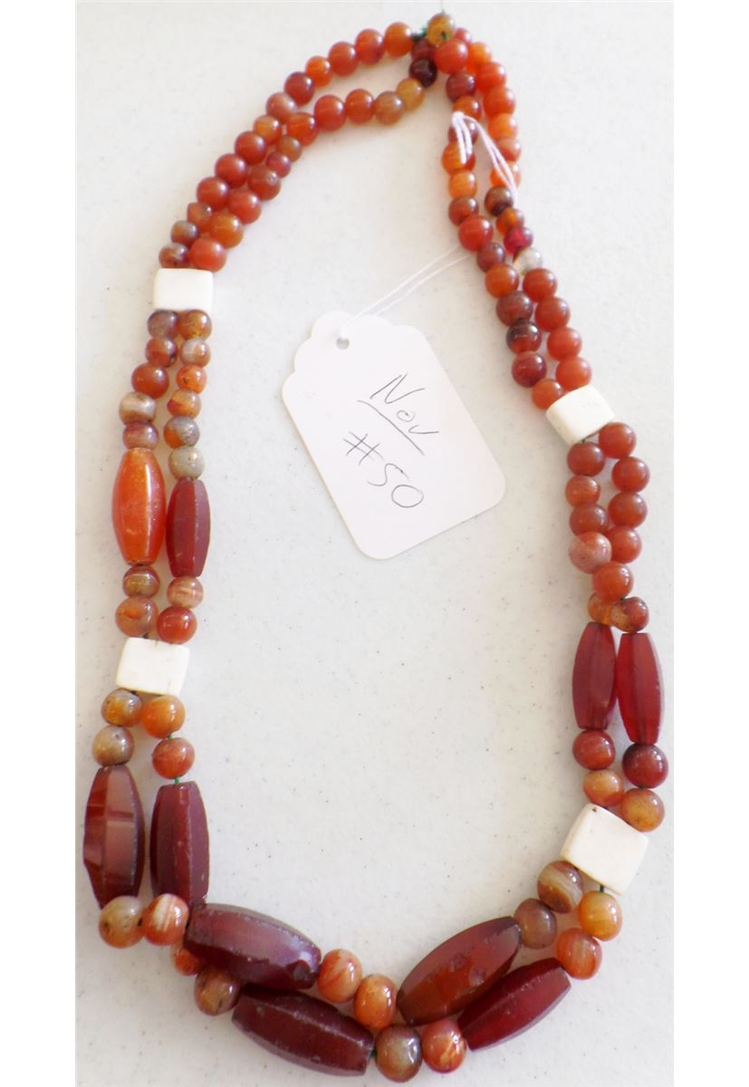 Double Stranded Carnelian Bead Necklace w/Bone Spacers. C.1880's. Made of beads and bone. Necklace measures approx. 12" as worn. From North America. Condition: Some nicks and scratches, see images. Shipping: $14.50