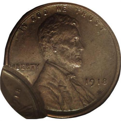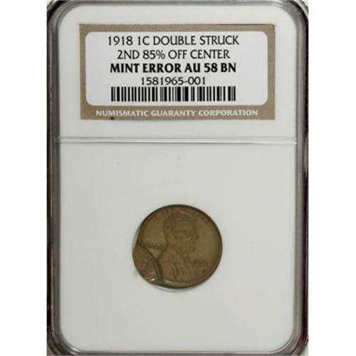 <B>1918 1C Lincoln Cent--Double Struck, 2nd Strike 85% Off Center--AU58 NGC.</B></I> The first strike is normal, and the second strike is 85% off center toward 10 o'clock, at 8 o'clock relative to the first strike. No additional planchet was fed between the dies for the second strike. A lustrous and bold example with pleasing blended golden-brown and apple-green toning.<BR><BR><B>Coin Engraver:</B> Victor D. Brenner<BR><BR><b>Shipping:</b> Coins & Currency (<a target="_blank" href="http://www.heritageauctions.com/common/shipping.php">view shipping information</a>)