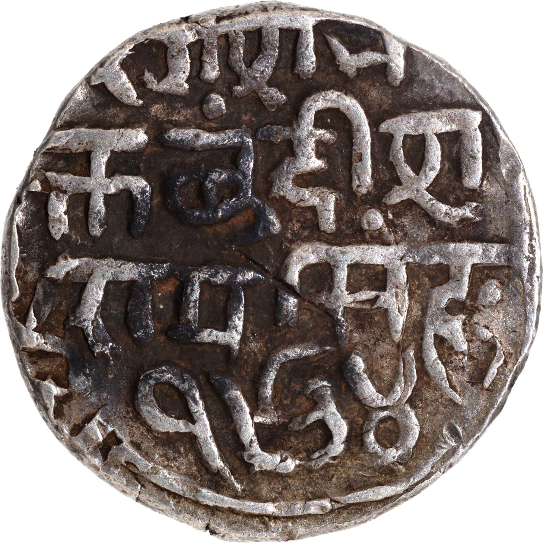 Bundi State, Ram Singh (VS 1878-1946, 1824-1889 AD), Silver Rupee (Nazarana like), Large flan with complete Legend, Error: double struck error on both sides, VS 1934/1877 AD, with the name of Queen Victoria, Obv: English legend ‘VICTORIA QUEEN 1877’, Rev: Nagari legend ‘Bundisa Rama Singha 1934’, 10.9g, 26.24mm, (KM # 6), about very fine, Rare.