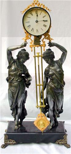 Swing Arm Clock by Ansonia with double female figures-Huntress and Fisher- comprise the swinger. 24 ½" high.