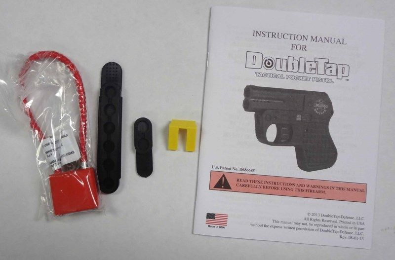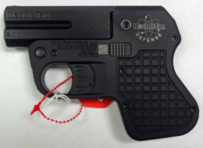 Double Tap Defense Derringer. 9mm. New in box. Break open action. Integral textured grips. Capacity: 2. Fixed sights. Features: holds 2 spare rounds in grip, hammerless, 5/8" wide, double-action trigger system. EST:$500-$550