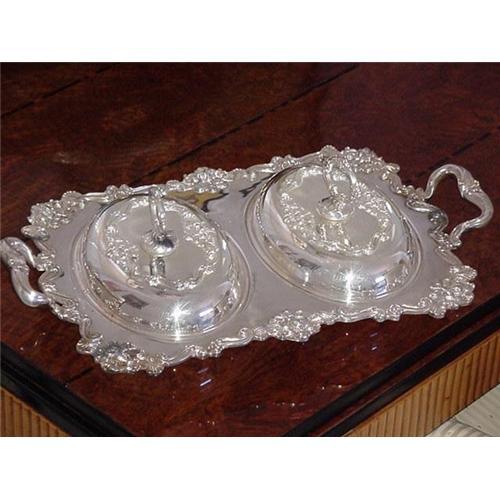 A large double vegetable dish, 20" long (handle to handle)12 1/2" wide, there are two oval vegetable dishes, 9" X 6 1/2", each with a lid and the lids have removable handles so that the lids can be used as vegetable dishes also. A very elegant serving piece with elaborate border, this will be a beautiful addition to you table. The condition is good, there are some age marks and some minimal scratches from use but it will polish beautifully. The piece is marked with the hallmarks of The Sheffield Silver Co, Made in the USA. Makers of plated hollowware. Large zippered felt bag included. (9)