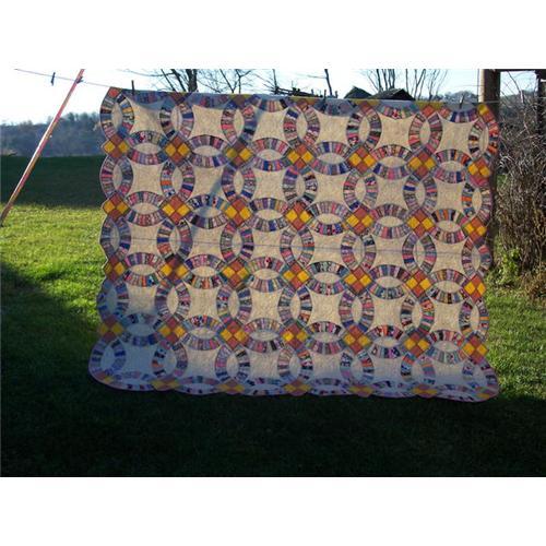 <table width="100%" border="0" cellspacing="0" cellpadding="4"><tr><td><em> </em></td></tr><tr> <td width="100%"> I absolutely love this quilt and had a hard time letting it go but I have too many.This is a beautiful entirely hand quilted Double Wedding Ring quilt.It measures 88x73-a nice size.There are some stains on the back that I am very sure will come out.I have not laundered it as I have so many to list but am quite sure it will wash up nicely.The design on the back is even pretty with a nice pink binding.Wonderful Christmas present!!The third picture makes the quilt look dirty but it is not,has to do with the lighting I think. </td></tr><tr> <td> </td></tr><tr> <td>Reference #: 1892</td></tr><tr><td>Condition:good</td></tr><tr><td>Year:1930-40</td></tr><tr><td>Title:Double Wedding Ring Quilt</td></tr><tr><td>Location:Viroqua,Wisconsin</td></tr></table>