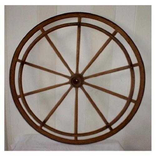 We believe this wheel is from an Antique wheel chair. The main wheel is 28" round and has 10 spokes and is banded in iron. There is a second hand wheel attached that is 23 1/2" round, and stands 1 1/2 inches above the big wheel, seems to be right position for hand wheel.<p>a lucky find for a replacement piece or Would make a great base for a ceiling light, a wall hanging, or just lay it in any where inside of outside for conversation piece.
