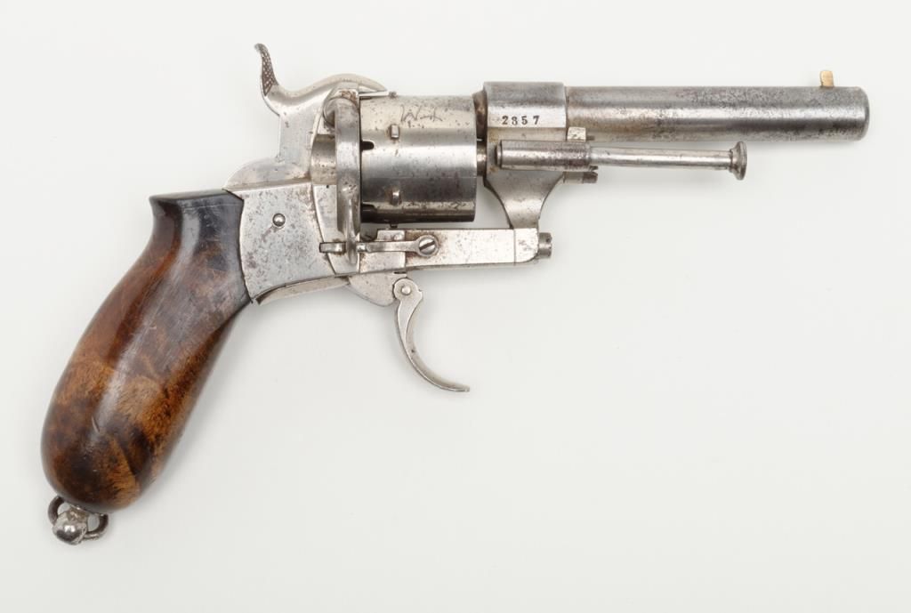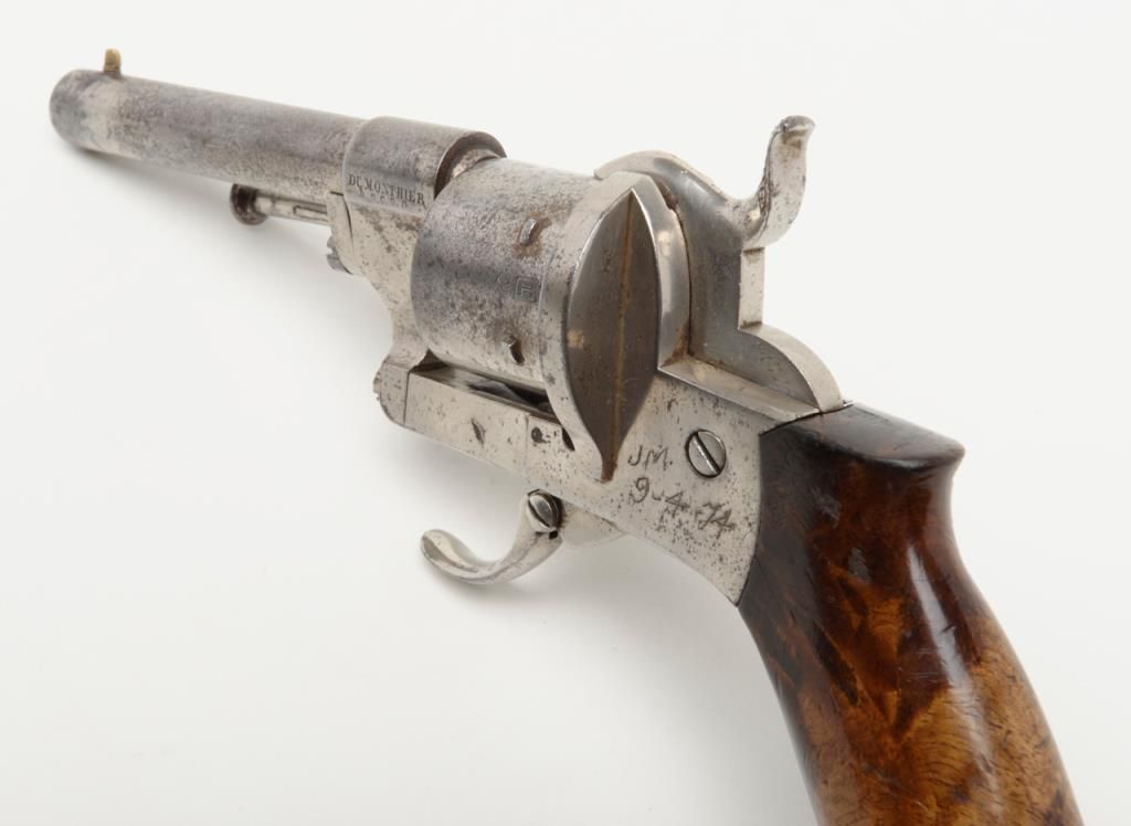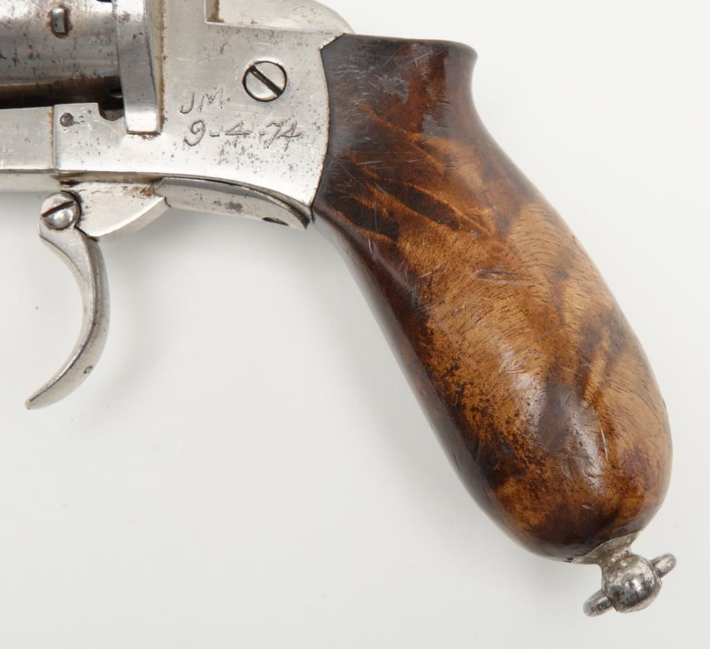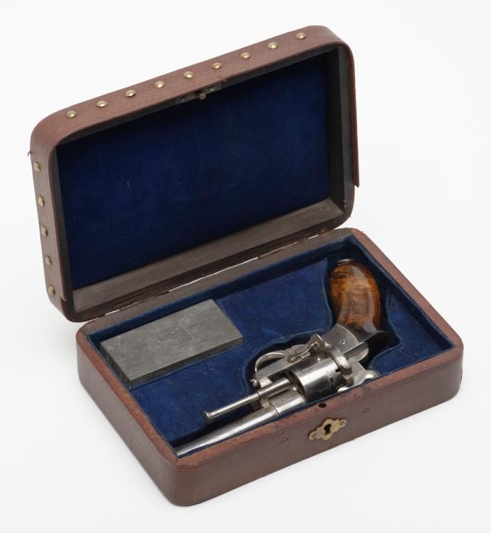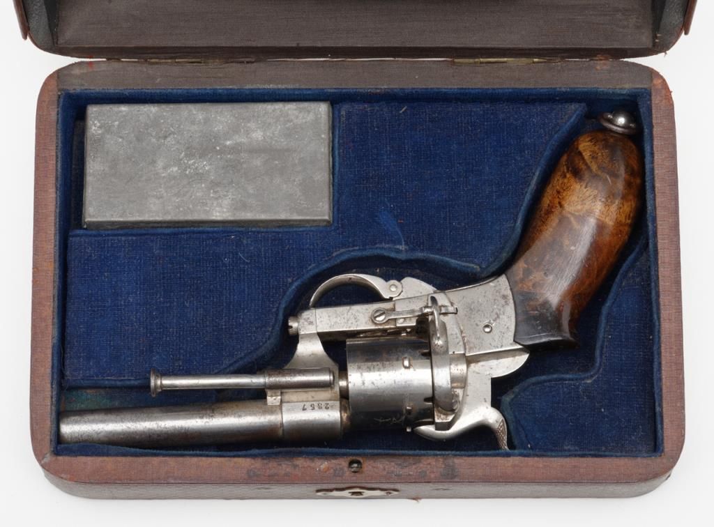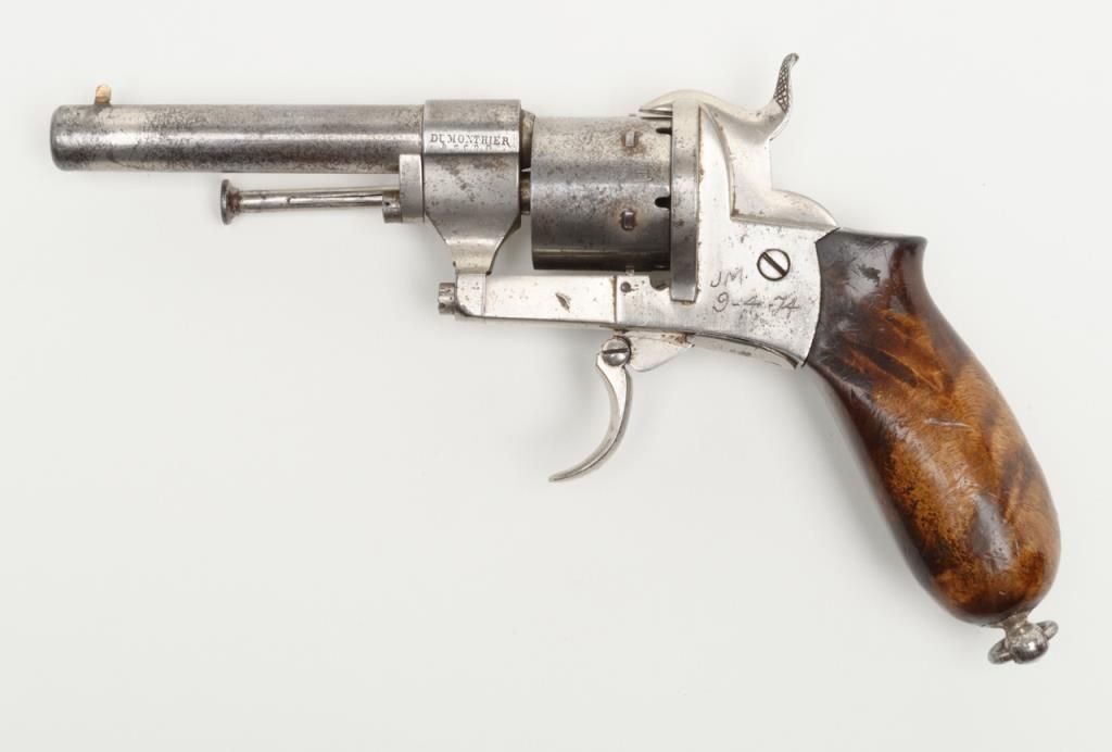 Double action pinfire revolver marked “Dumonthier” and is approximately 7.5 mm with nickel plated finish, burl Walnut grips, serial number 2357 in original trunk style French fitted case. The metal surfaces show 60% to 80% original nickel withsome erosion and pinprick pitting just starting where the nickel has lifted. The initials J.M. are scratched in 2 places on the pistol with the date “9-4-74” (Sept. 4th, 1874). The pistol measures 9” overall with a 3 ¾” barrel and is of a slightly larger size than normally found and fits a large hand well. Dumonthier was a famous French arms maker and inventor most recognized for his knife pistols. The pistol is cased in the fitted French style and the case remains in very good conditionwith just some minor fraying and impressions. A tin cartridge box is included. The exterior of the case is brown dyed Moroccan leather with an embossed pattern and brass tacks. The exterior of the case is very good with normal aging and ismissing its handle or strap. Est.: $750-$1500