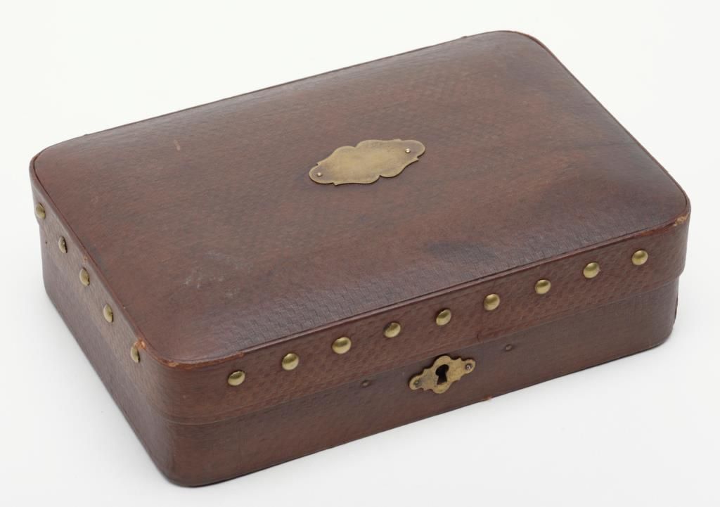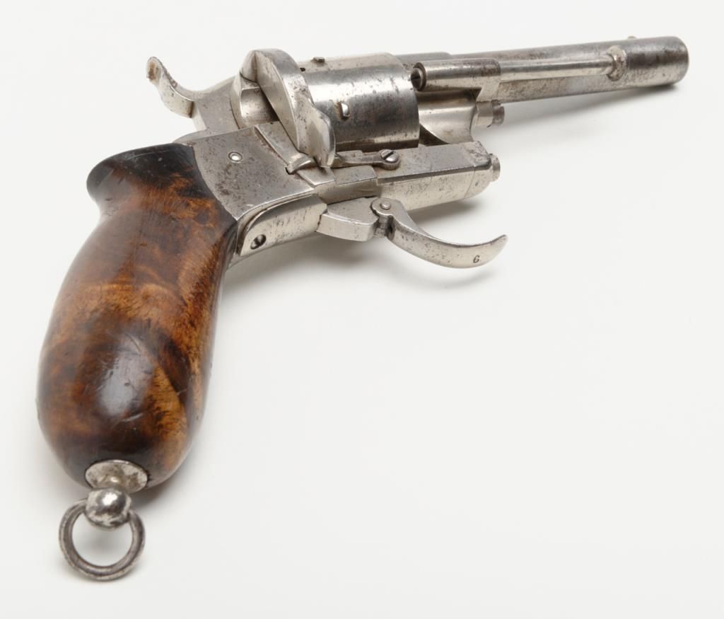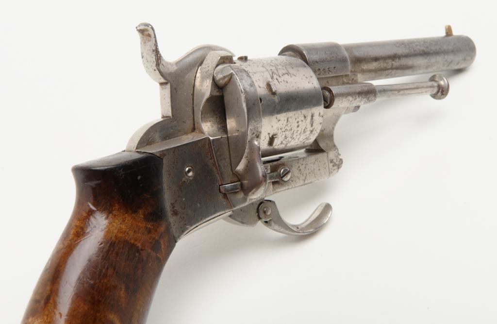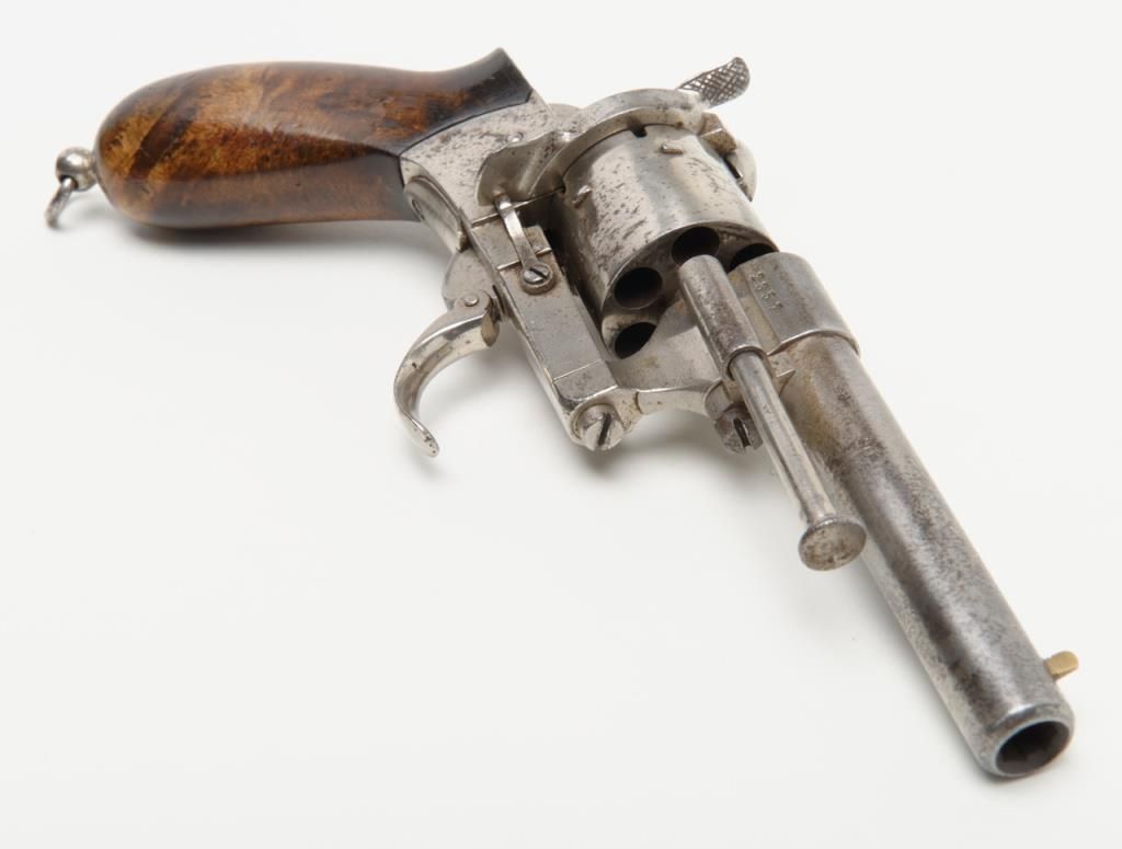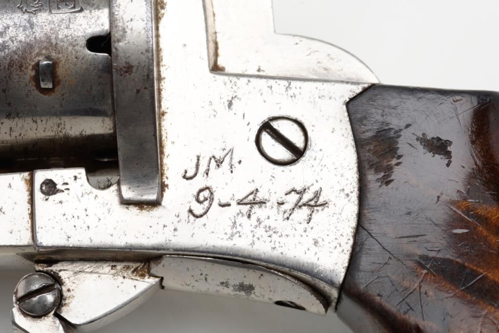 Double action pinfire revolver marked “Dumonthier” and is approximately 7.5 mm with nickel plated finish, burl Walnut grips, serial number 2357 in original trunk style French fitted case. The metal surfaces show 60% to 80% original nickel withsome erosion and pinprick pitting just starting where the nickel has lifted. The initials J.M. are scratched in 2 places on the pistol with the date “9-4-74” (Sept. 4th, 1874). The pistol measures 9” overall with a 3 ¾” barrel and is of a slightly larger size than normally found and fits a large hand well. Dumonthier was a famous French arms maker and inventor most recognized for his knife pistols. The pistol is cased in the fitted French style and the case remains in very good conditionwith just some minor fraying and impressions. A tin cartridge box is included. The exterior of the case is brown dyed Moroccan leather with an embossed pattern and brass tacks. The exterior of the case is very good with normal aging and ismissing its handle or strap. Est.: $750-$1500