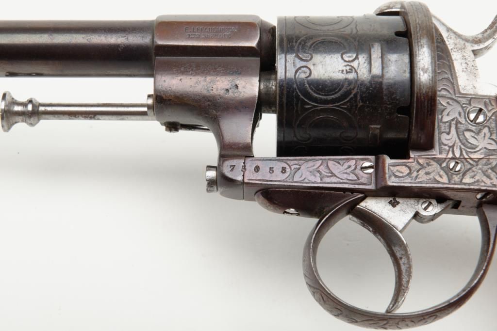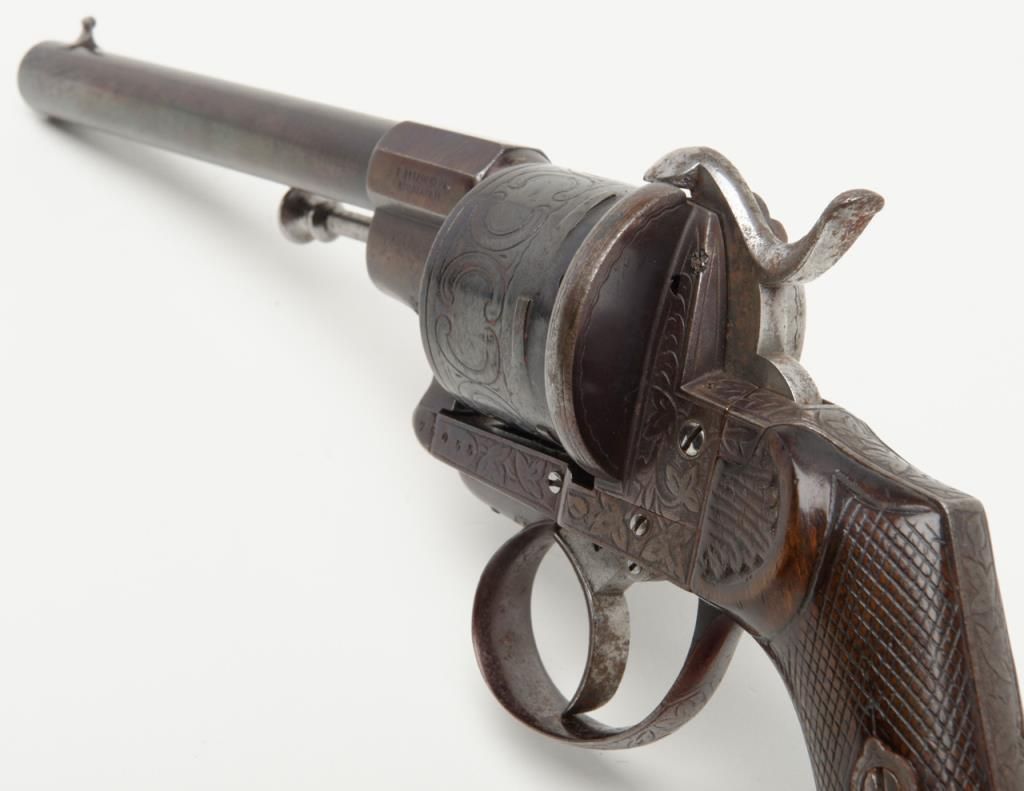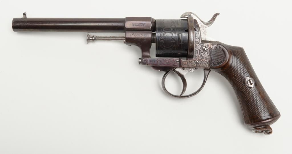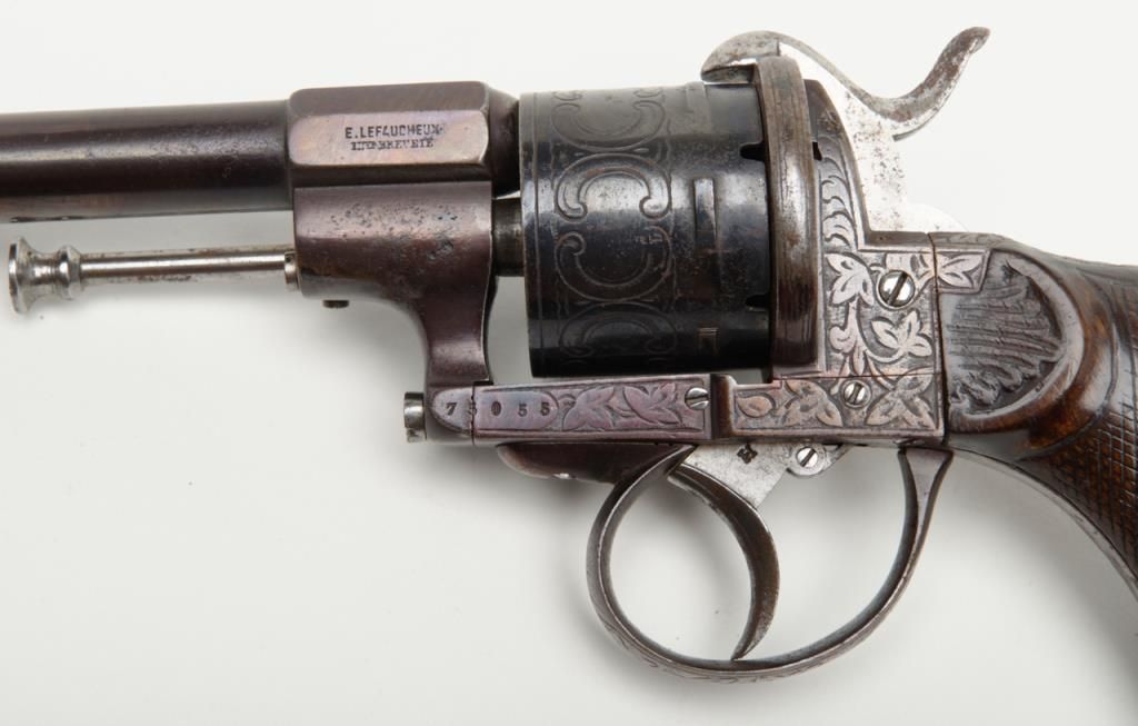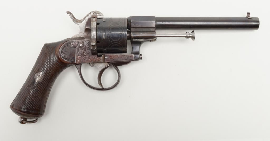 Double action pinfire revolver marked “E. Lefaucheux, Brevet” engraved on the frame, checkered wood grips, serial number 7058 stamped on left side of the frame. The revolver measures 12” overall with a 6 ¼” barrel of approximately 11 mm pinfire. The revolver shows 75% to 85% of an old re-blued finish with some minor pitting and erosion. The grips show some highpoint wear and are fair to good. The action works well and the marks are fairly sharp and well defined. Est.:$400-$800