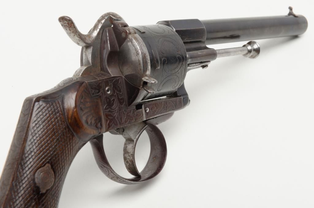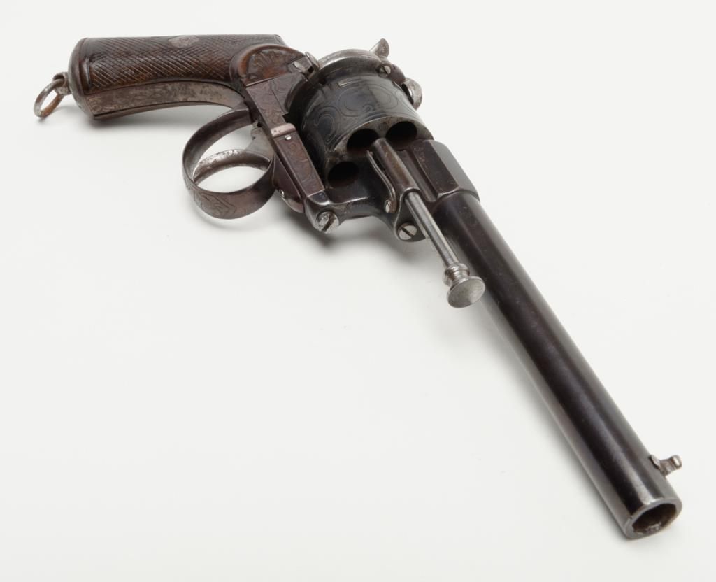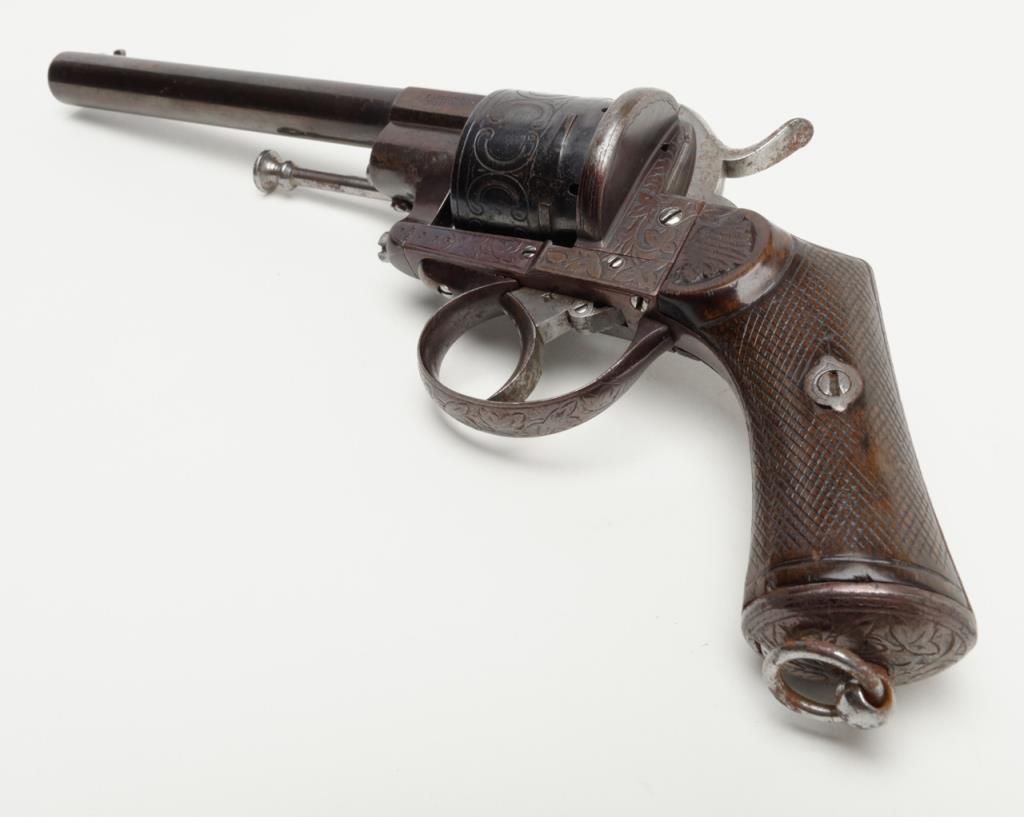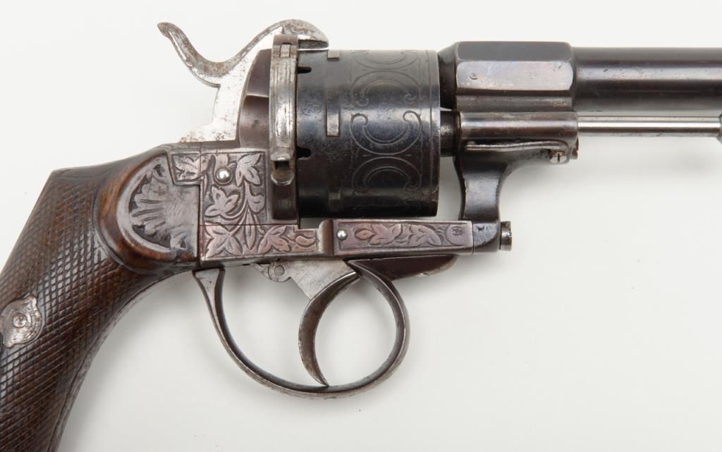 Double action pinfire revolver marked “E. Lefaucheux, Brevet” engraved on the frame, checkered wood grips, serial number 7058 stamped on left side of the frame. The revolver measures 12” overall with a 6 ¼” barrel of approximately 11 mm pinfire. The revolver shows 75% to 85% of an old re-blued finish with some minor pitting and erosion. The grips show some highpoint wear and are fair to good. The action works well and the marks are fairly sharp and well defined. Est.:$400-$800