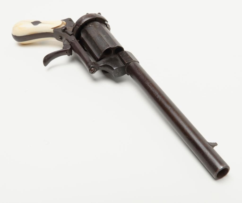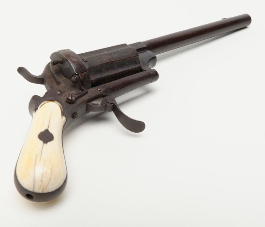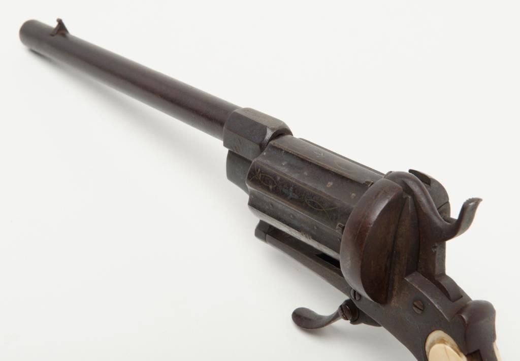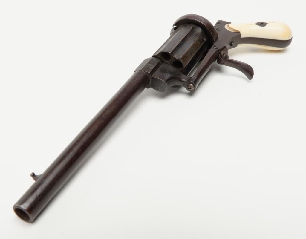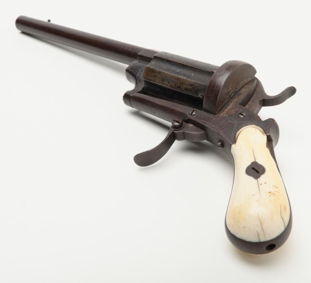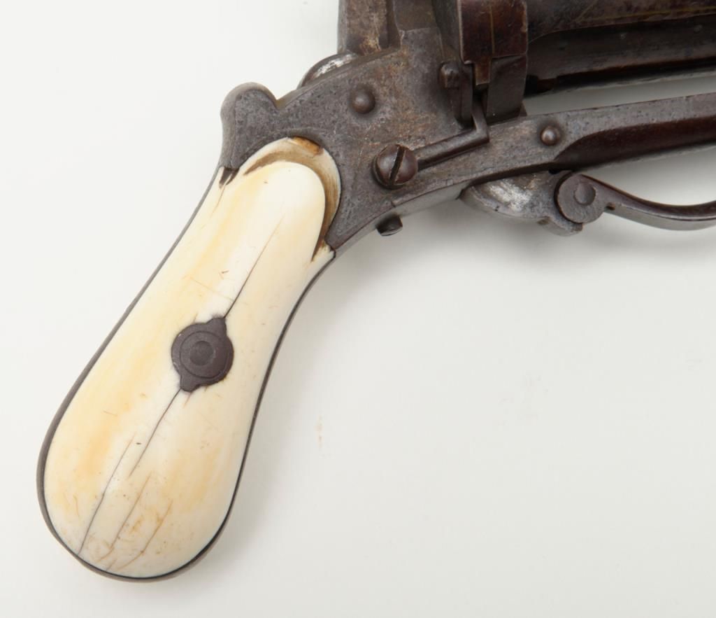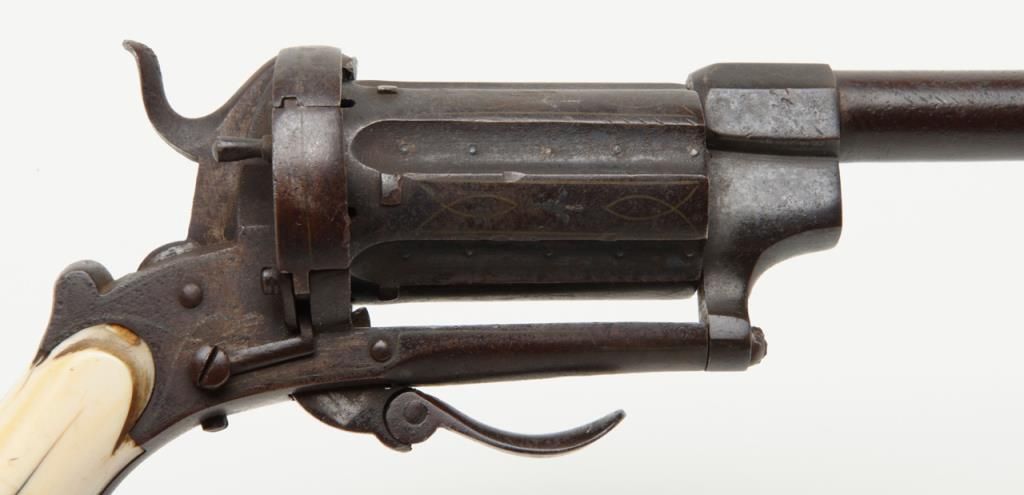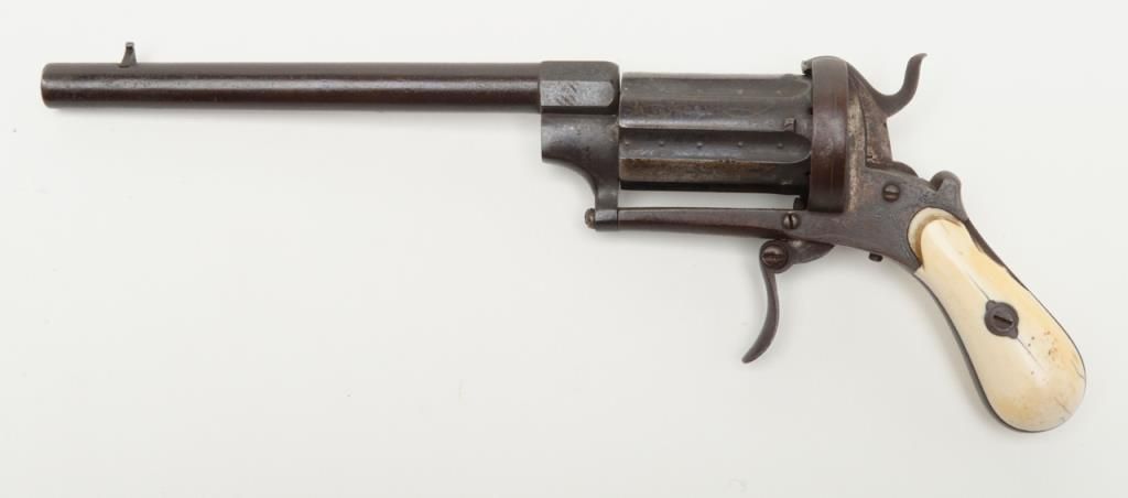 Double action pinfire revolver with unusually long cylinder and barrel, silver inlaid with ivory grips and no visible makers name or proofs. The revolver measures 10 ¼” overall with a 5 ½” barrel and is in approximately 7.5 mm pinfire with a six shot cylinder. The cylinder measures 1 7/8” in length. The metal surfaces show traces of original blue within a brown patina finish with some silver line and dot inlay on the cylinder and barrel which is un-cleaned and darkened. Theoriginal to the period ivory grips are good with age cracking and fit well with a couple of small losses and chips. The action is not working. An interesting pinfire that will clean and restore nicely. Est.: $500-$1,000