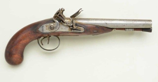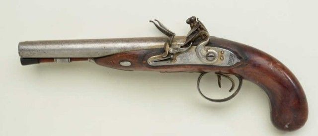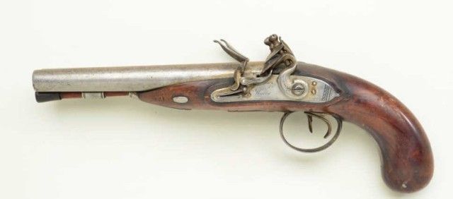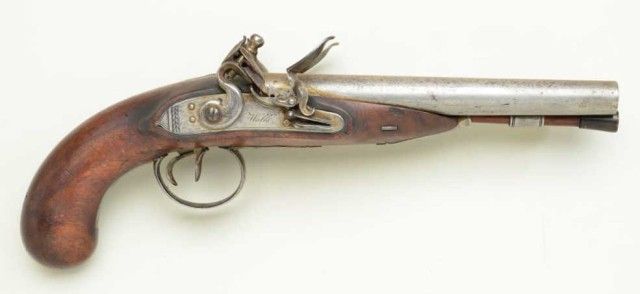 Double barrel Flintlock pistol signed “Walls” on both locks with no location and no visible proofs. The pistol measures 14”overall with 8” barrel mounted side by side and each approx 62 cal smooth bore. The pistol is iron mounted, plainly stocked. The condition is good with gray metal patina, light to moderate erosion and pinprick pitting. The stock is very good. The engraving on mounts and lock are fairlycrisp. A horn tipped ram rod is included. The small parts and screws are all original. The fore end shows one chip which is approx 8mm by 2mm. Last sold Richard K. Bourne auctioneer for James Elwood Jones collection1981. From an old N.Y. collector’s estate. Est.;$1,250-$2,500.