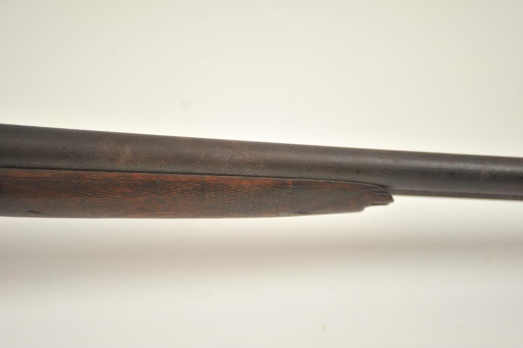 Double barrel SxS hammer shotgun, 12 gauge in relic/wall hanger condition with 32” barrels. The shotgun is covered in moderate to heavy rust with a full-length rib and double set triggers. The checkered wood butt stock is in fair condition. Est.: $50-$100. (Antique).