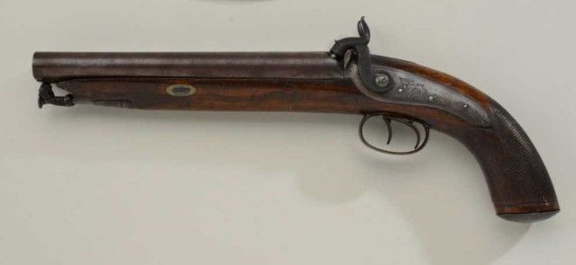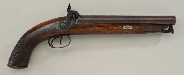 Double barrel percussion “Howdah” style pistol signed “C. Maybury, St. Mary’s Square, Birmingham”. The pistol measures 16” overall with 8-3/8” barrels of appox. 67 cal smooth bore. Pistol shows late percussionera back action locks. The pistol is full stocked with a swivel ram rod. The barrels show a Damascus pattern with approx 50% brown, some minor pitting and erosion. The locks show traces of case hardening, thehammers have gone to a dark patina. The stock is good with fairly crisp checkering, some minor dings, mars and many small type scratches in its finish. The action is crisp and the trigger guard shows traces of blue.A great back up when a wounded tiger charges. Est.;$1,400-$2,800.