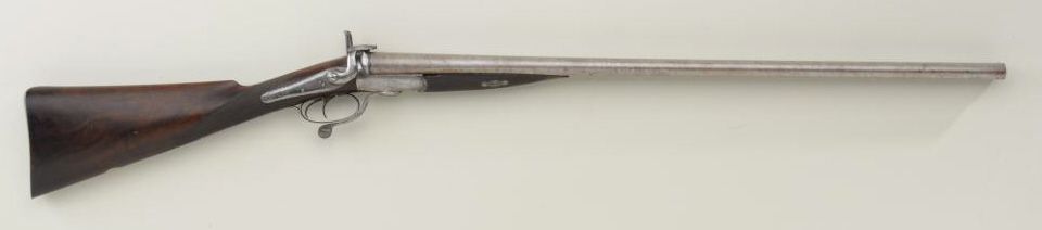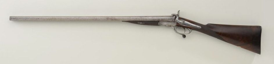 Double barrel pinfire shotgun by Collings & Wallace of London; approx. 12 gauge, 30” barrels, circa 1865 to early 1870’s; under lever action, scroll engraved locks and frame; metal surfaces show a grey to brownpatina finish with traces of Damascus pattern on barrels; stocks are good, bores are rough. Est.: $600-$1,200.