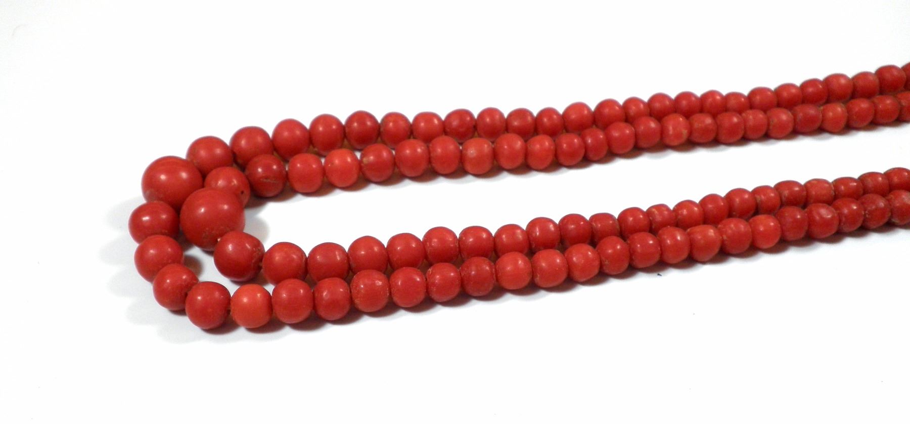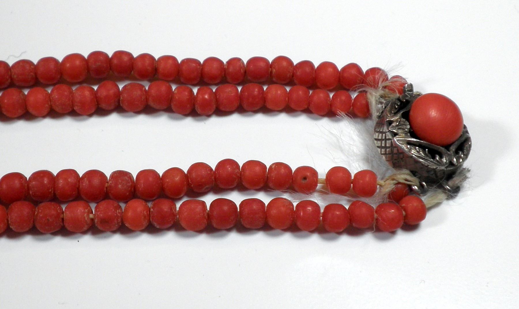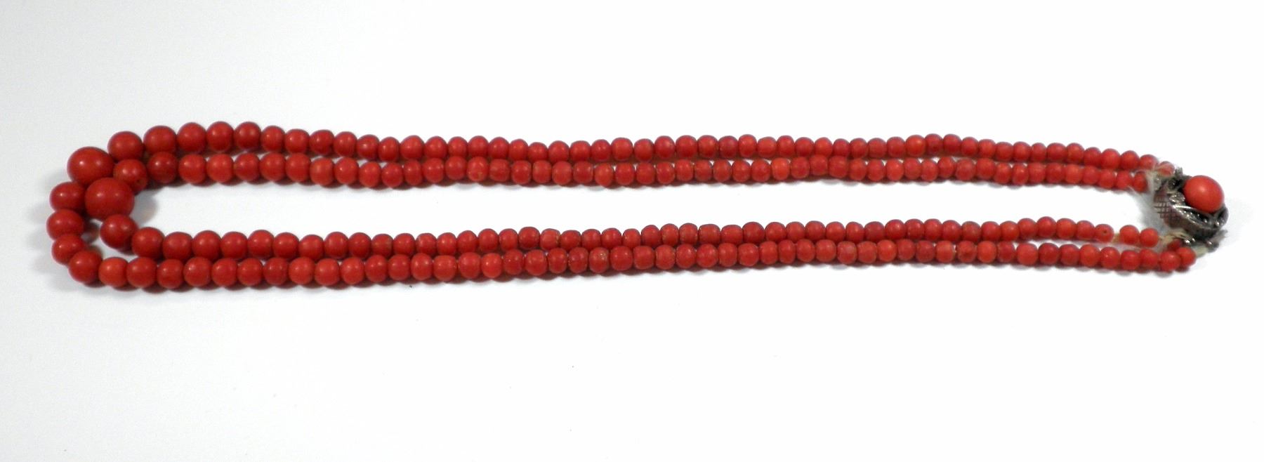 Double-layer Ard Deco coral necklace, red-salmon color corals, 800 silver clasp, total weight: 40 gm, length of necklace: 46 cm, diameter of beads: 5-10 mm.