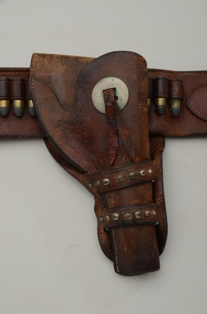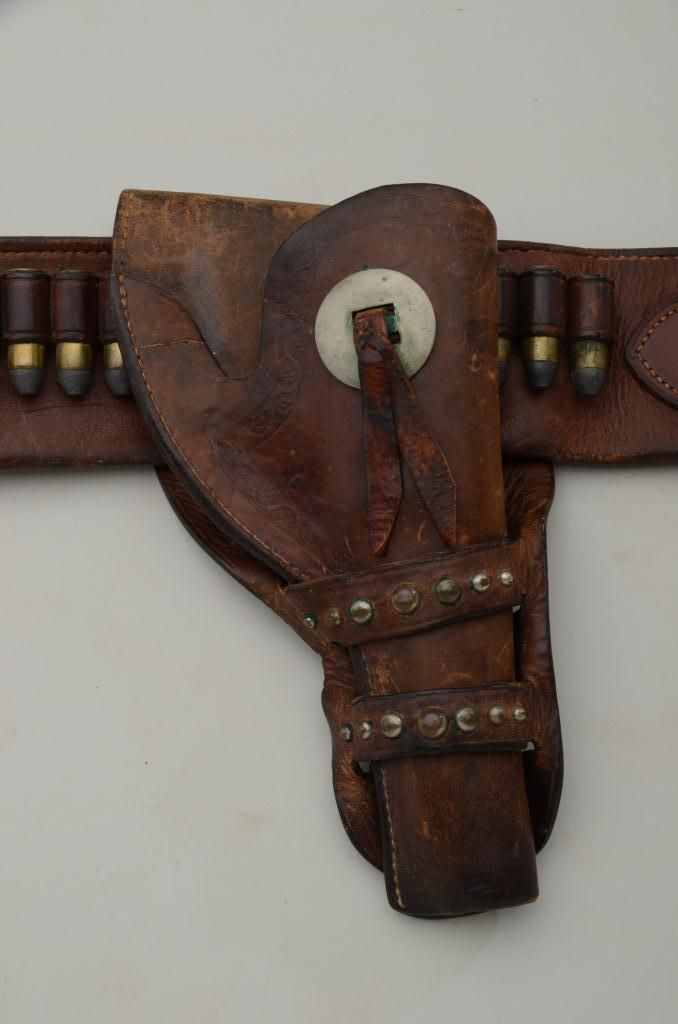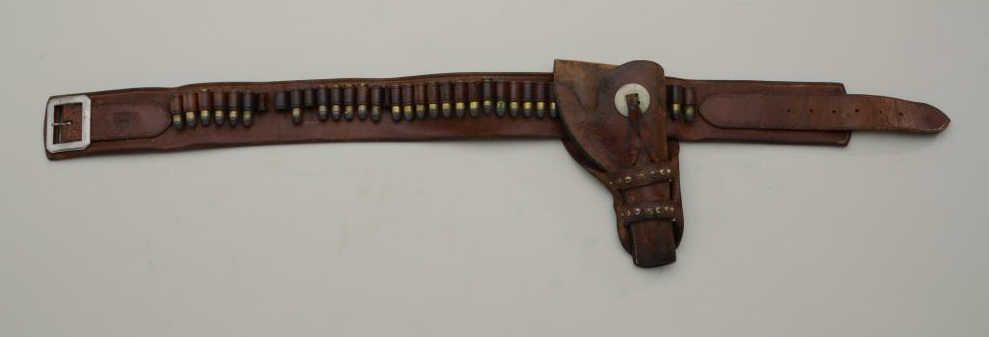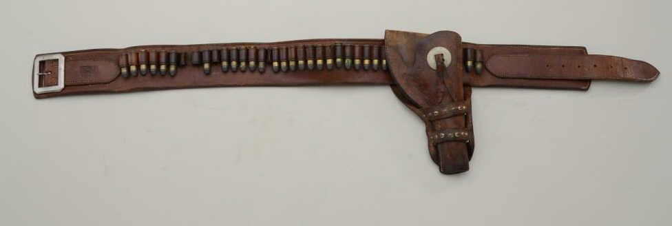 Double loop Western-style holster with combination money belt/cartridge belt which is marked S.D. Myers, El Paso Texas. The holster fits a 1878 double action Colt well and will also fit a single action with a bitof extra room. The money belt combination cartridge belt measures approximately 3 inches in width and is in very good condition. The holster has been with this belt a long time but is not marked and notmade by S.D. Myers and is probably a catalog ordered item of the same era. The holster shows brass tacks and a German silver Concho which are a nice southwestern decoration and are definitely of the period. The holster isin good condition. The tongue portion of the belt which holds the buckle is stamped with the initials C. G. J.. A nice rig. Estimate $600-$1,200