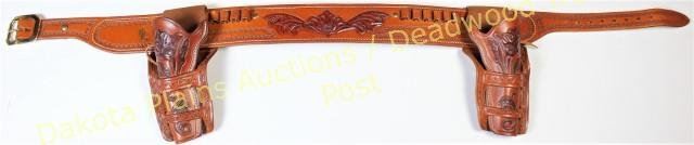 stamped TD, double rig for a pair of single actions in as new condition with clip corner buckle and nice tooling.