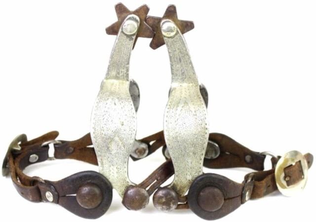 Double mounted split heel band spurswith 2" shanks and 5 pint rowels, nicely engraved, with straps. Est. 300-500