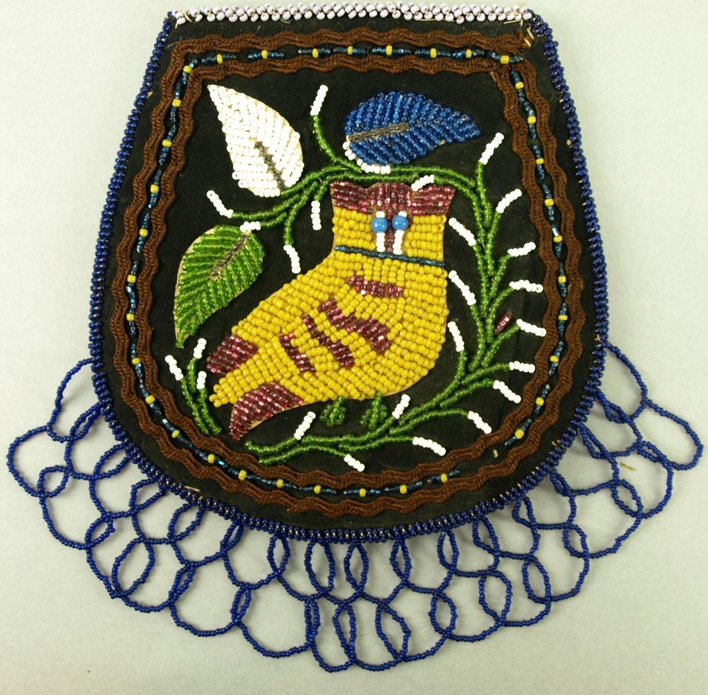 large pony beads in floral and bird motif, cotton lined. Fine overall condition. 9" X 10"