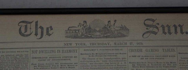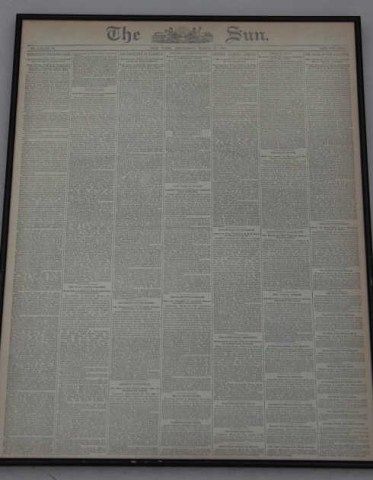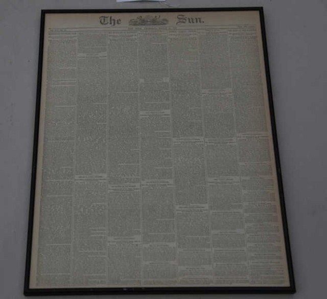 Double sided glass framed original copy of The Sun newspaper of New York dated Thursday, March 27, 1879, including news of the day and advertising; several “crime blotter” articles including reporting of a doublehanging in Virginia, the assassination of a Judge in Kentucky, the postponement of a prize fight in Pennsylvania and conditions between France and England; an interesting decorator. Est.: $25-$50.