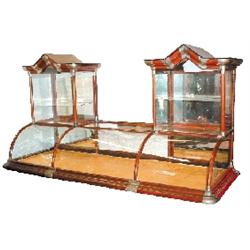 Double tower steeple curved glass showcase, walnut w/brass trim, mfgd. by Excelsior Showcase, Jos Kn