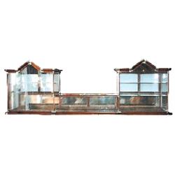 Double tower steeple flat glass showcase, walnut, mfgd. by J.F. Pieper & Co., Quincy, IL, 1 cracked side panel, 120"W x 40"H.