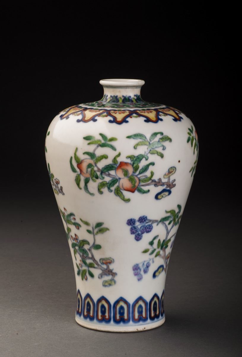 This Fine And Rare Porcelain Vase With Traditional Doucai Contrasting Glaze Throughout, Finely Potted With The Fruits And Green Branches Patterns At The Finely Potted Cavetto, Which Represents The Richness AndHappiness Towards Life. Heavily Potted Rim At The Mouth, With The Delicate Designed Ruyi-head Band Decorated Around The Shoulder And The Foot Edge.