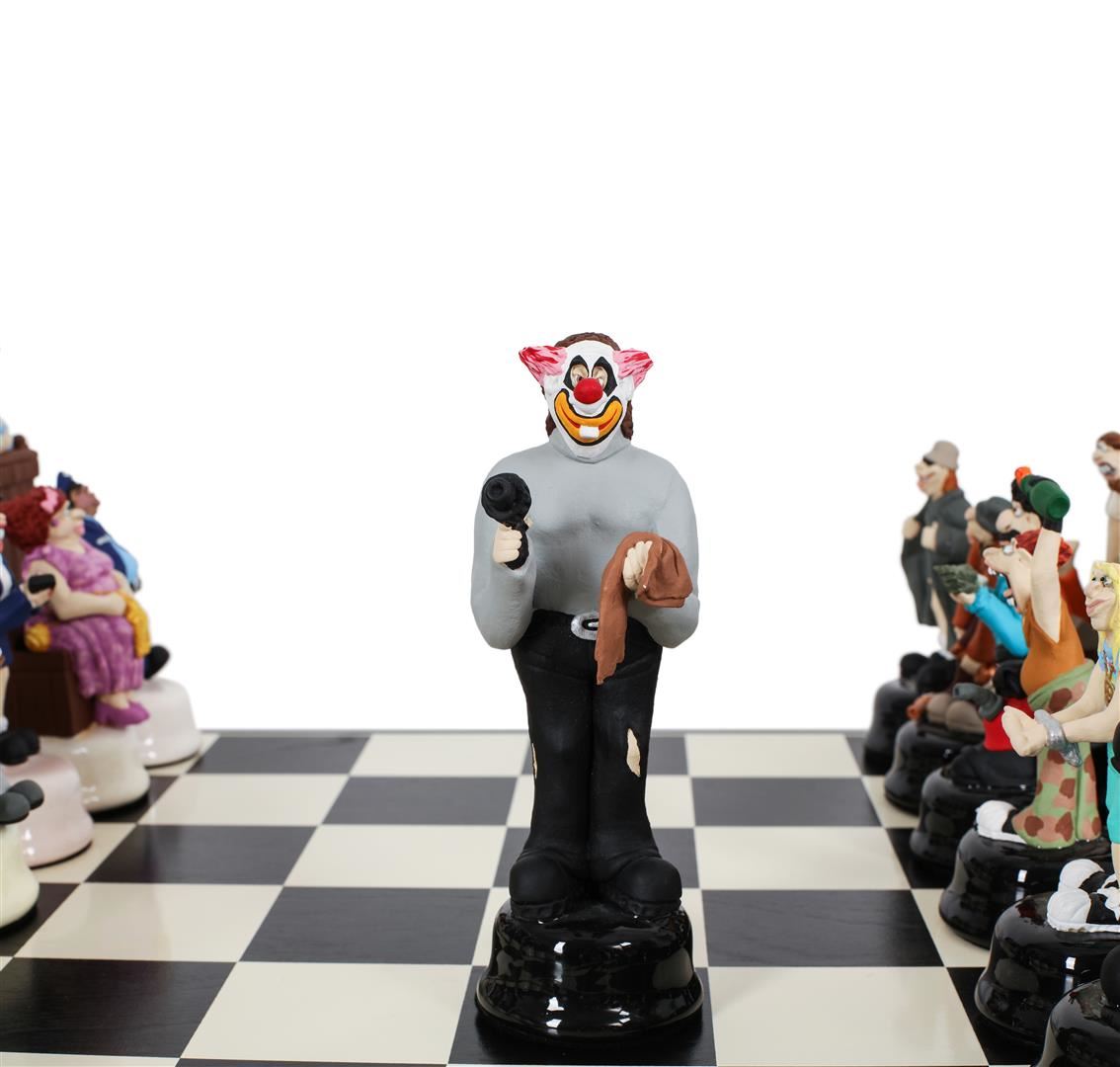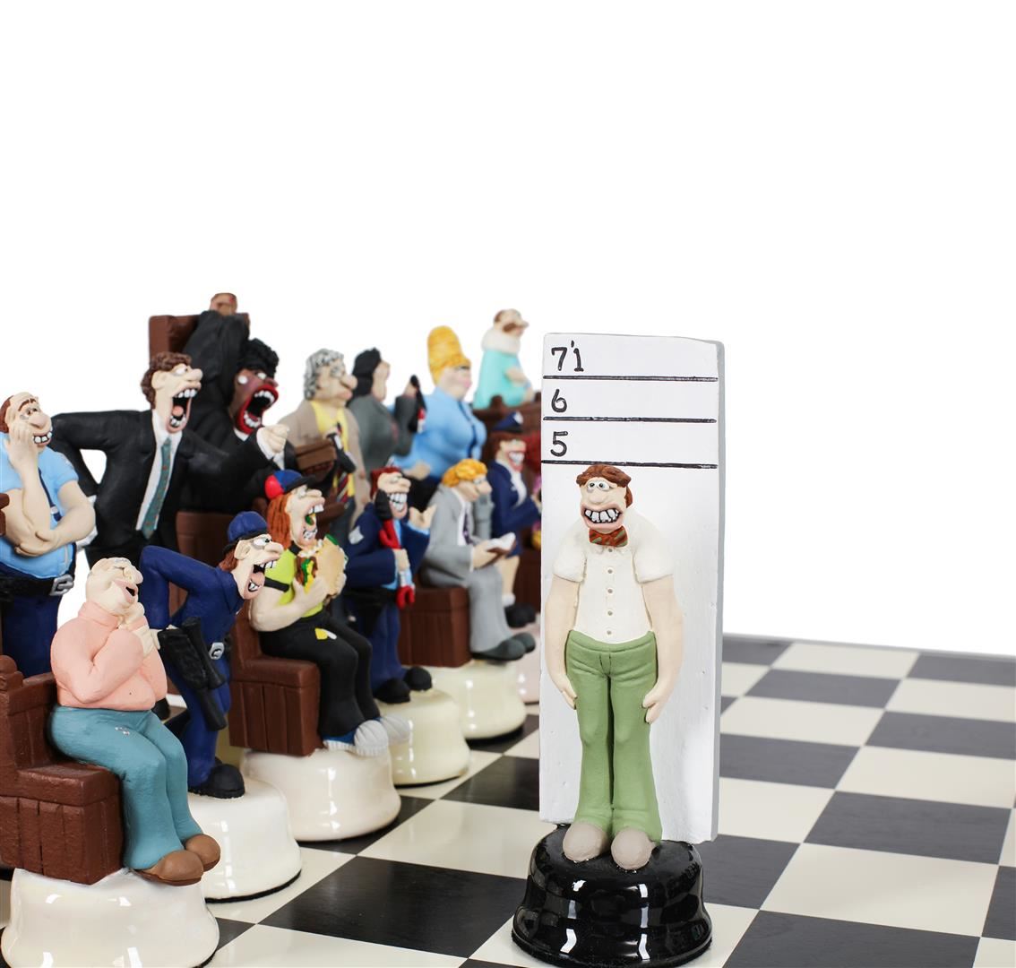 One Limited Edition, Doug Anderson Law and Order Chess Set, signed "Anderson". The production number, 176/250, is hand-printed on the bottom of the wall of one of the Rooks. . The Law and Order King (angry Female Judge) is 8-1/2? tall, the Queen (Male Pro