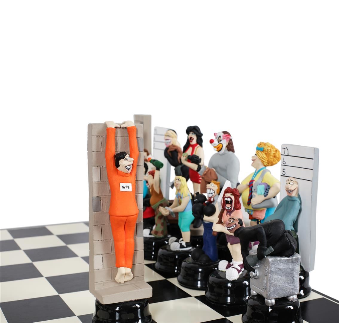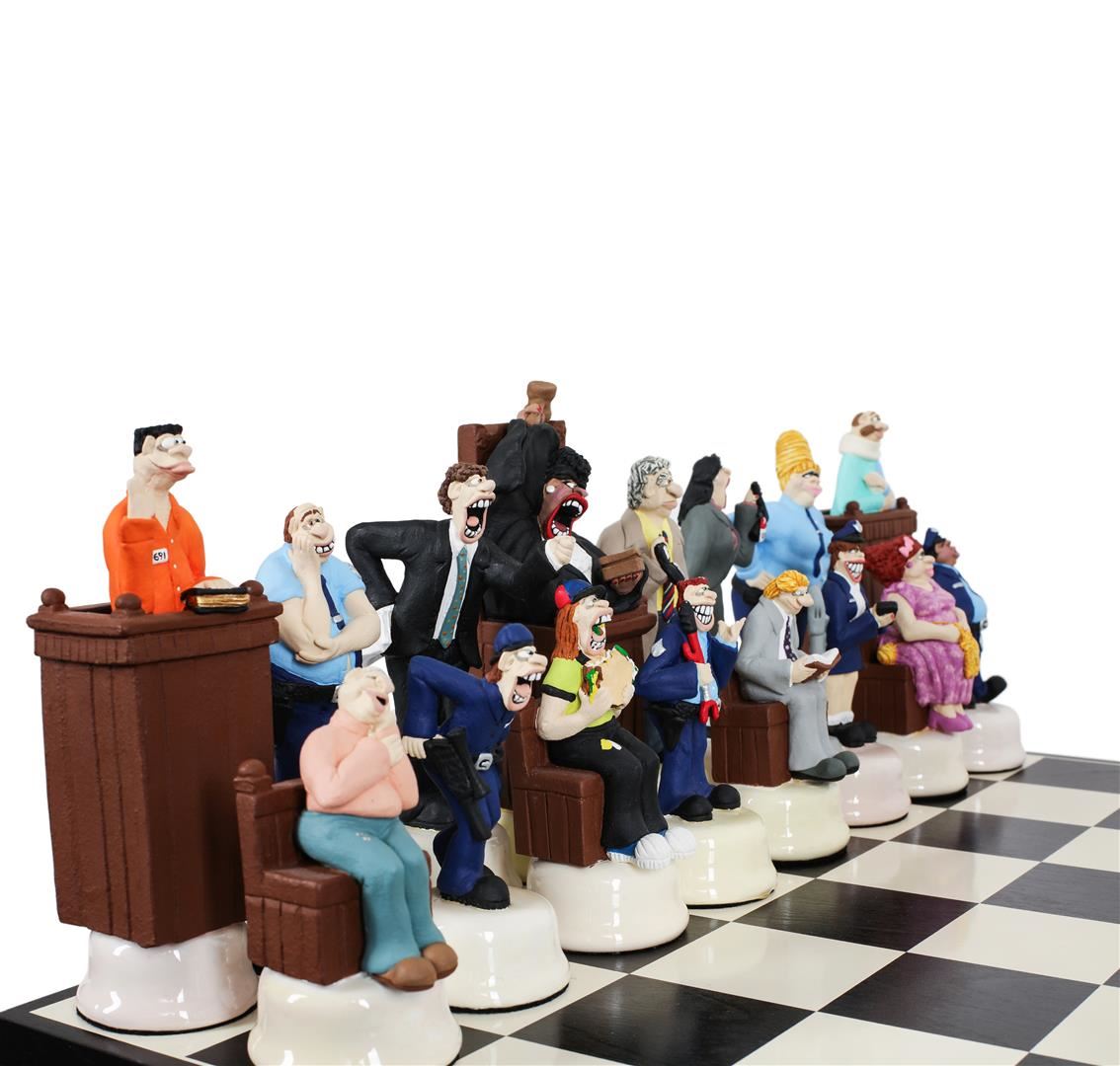 One Limited Edition, Doug Anderson Law and Order Chess Set, signed "Anderson". The production number, 176/250, is hand-printed on the bottom of the wall of one of the Rooks. . The Law and Order King (angry Female Judge) is 8-1/2? tall, the Queen (Male Pro